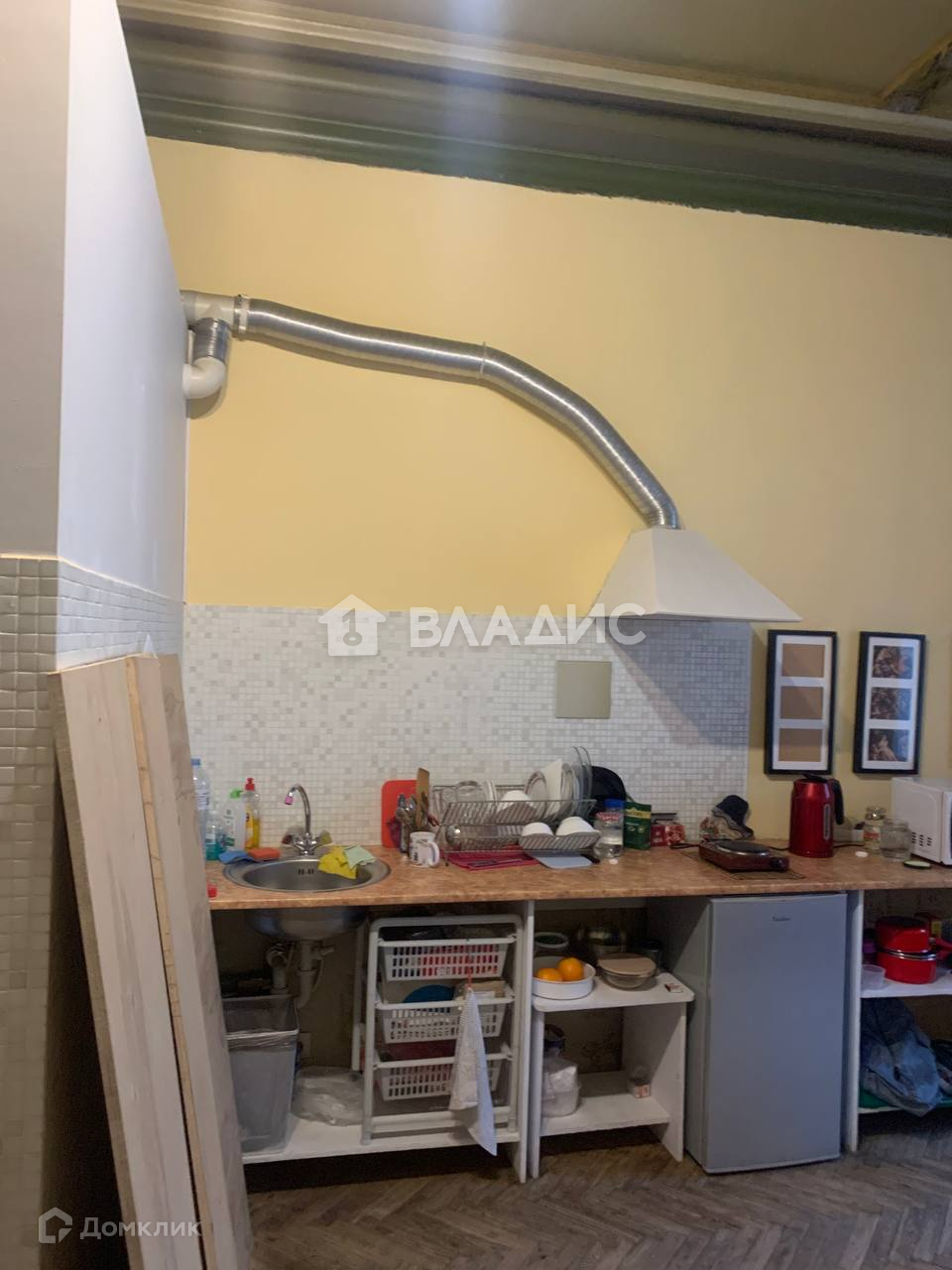 Кухонная зона оборудована кухонным гарнитуром и бытовой техникой: вытяжка, микроволновая печь, холодильник, варочная переносная панель с одной конфоркой. Есть так же кухонный стол, стулья и полки.