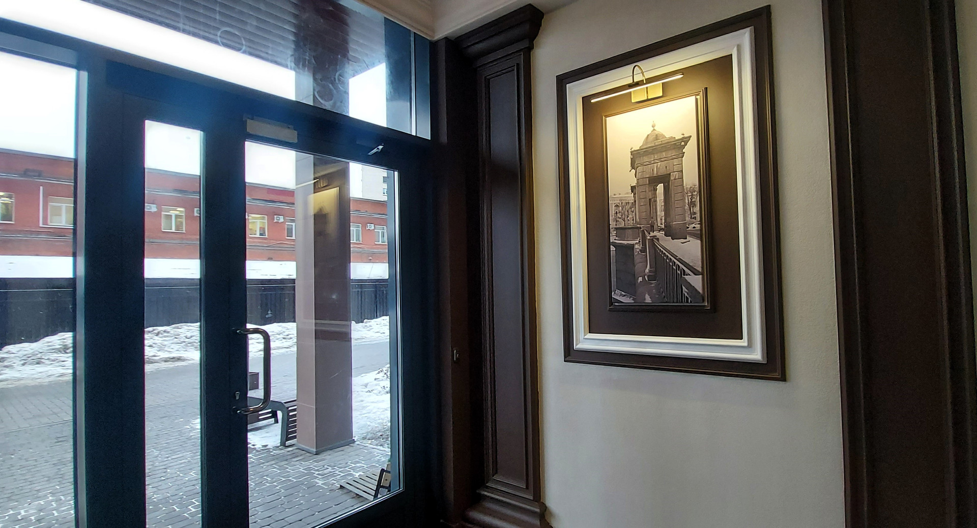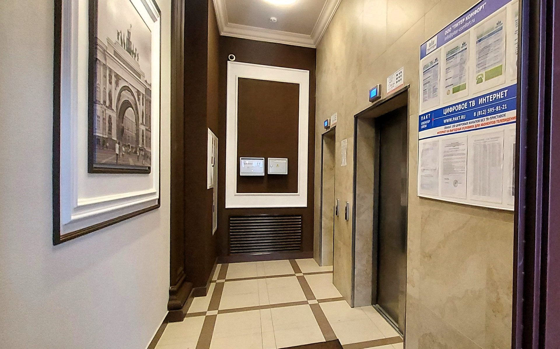 В холлах, в парадных - современный интерьер, установлены светильники, большие картины-постеры с архитектурными видами города;