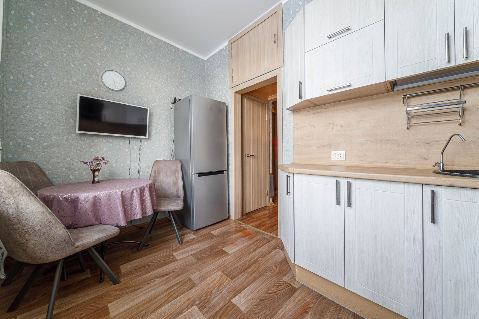 Остается современный кухонный гарнитур с газовой панелью, духовым шкафом , вытяжкой. Входная дверь двойная. Чистый подъезд . Квартира подходит для комфортной жизни .