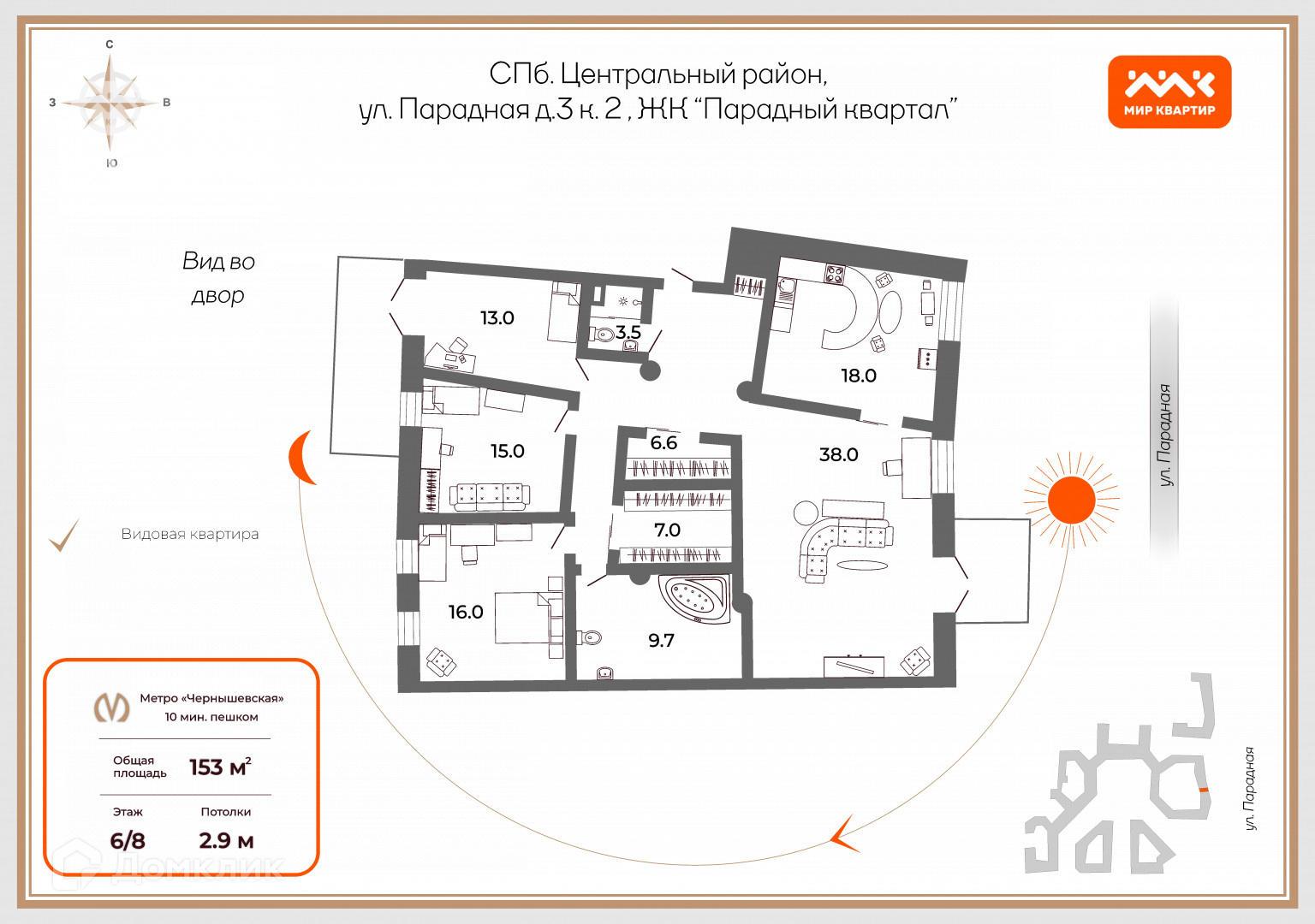 Квартира 2 сторонняя, хорошей планировки 153 кв.м., гостиная в 2 окна с открытым балконом , вид на Парадную улицу. Просторная кухня в 1 одно окно. 3 спальни с окнами выходящими в тихий двор, застекленная лоджия. 2 гардеробные, 1 совмещенная ванная,, совмещенная душевая, есть хамам. В квартире имеется приточная вентиляция. На лоджии кондиционер выведен в шахту.
