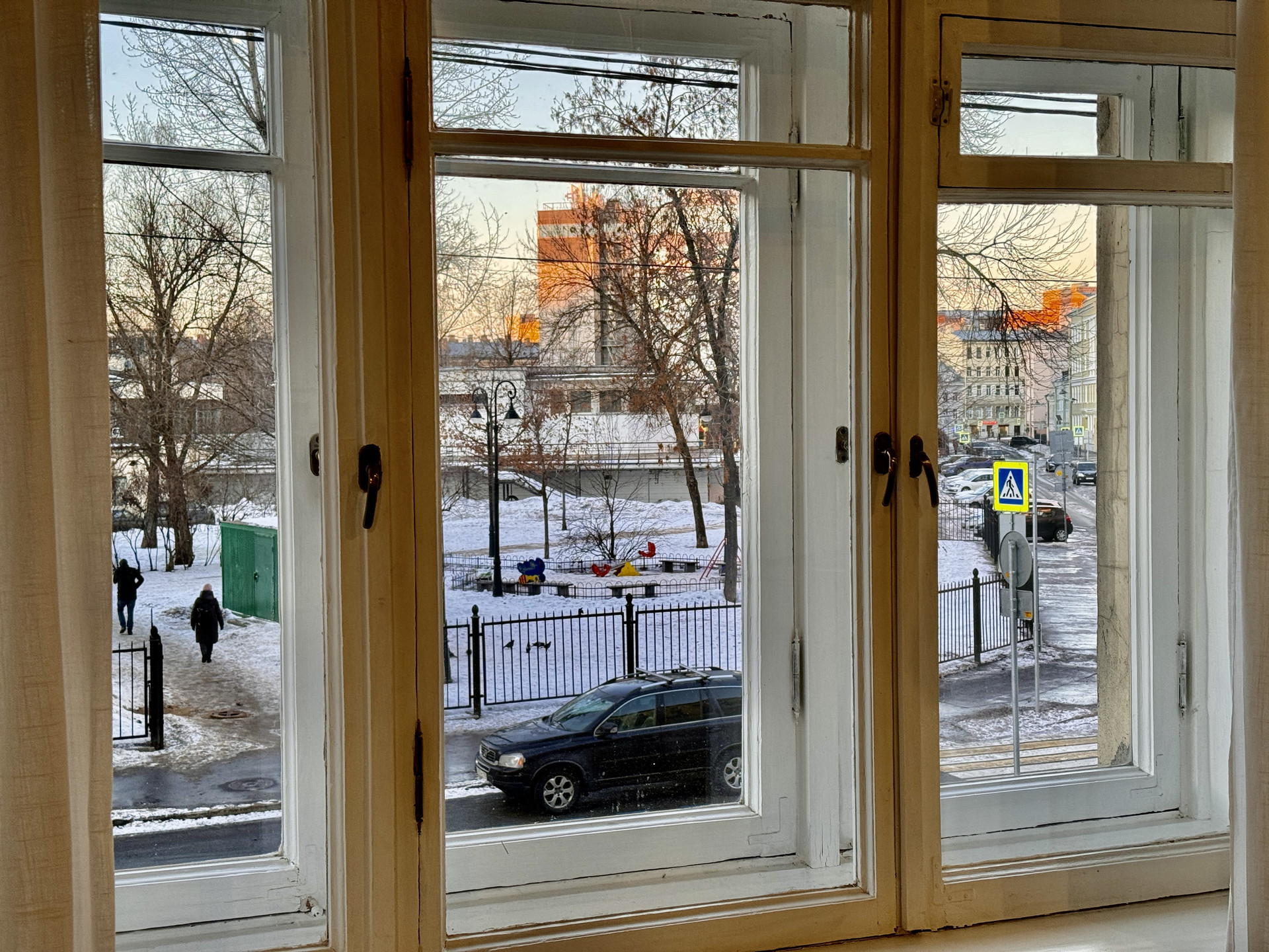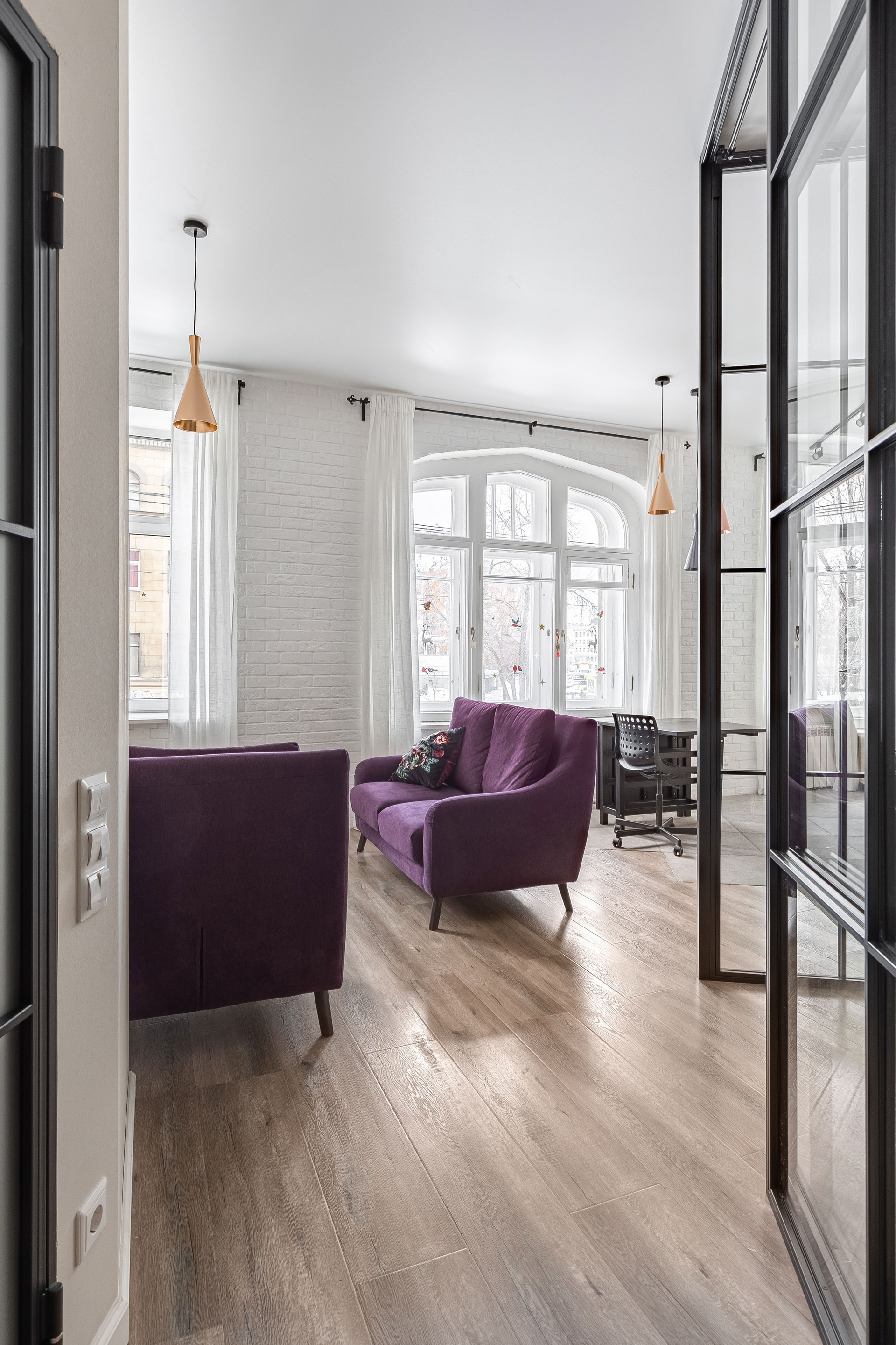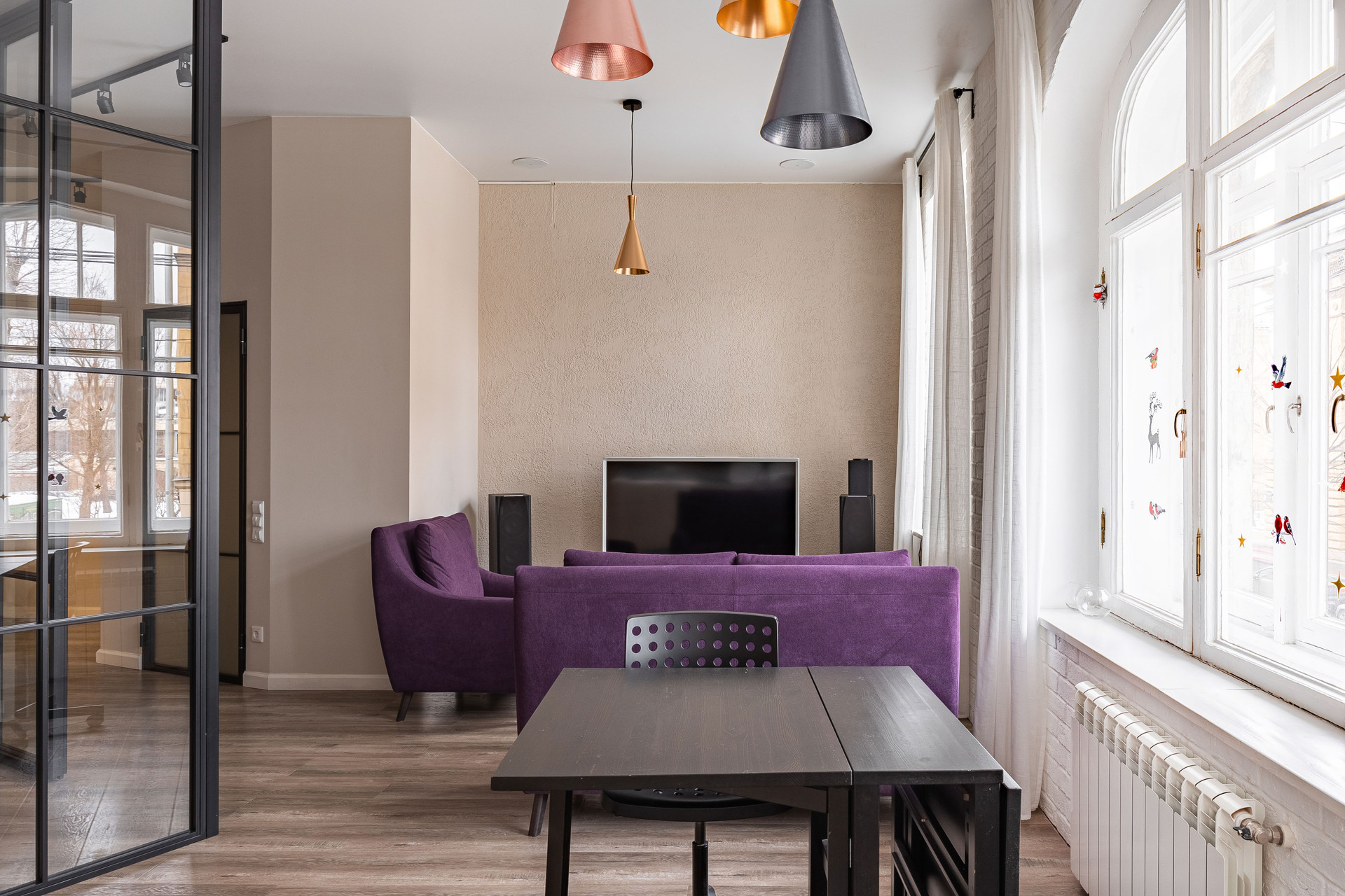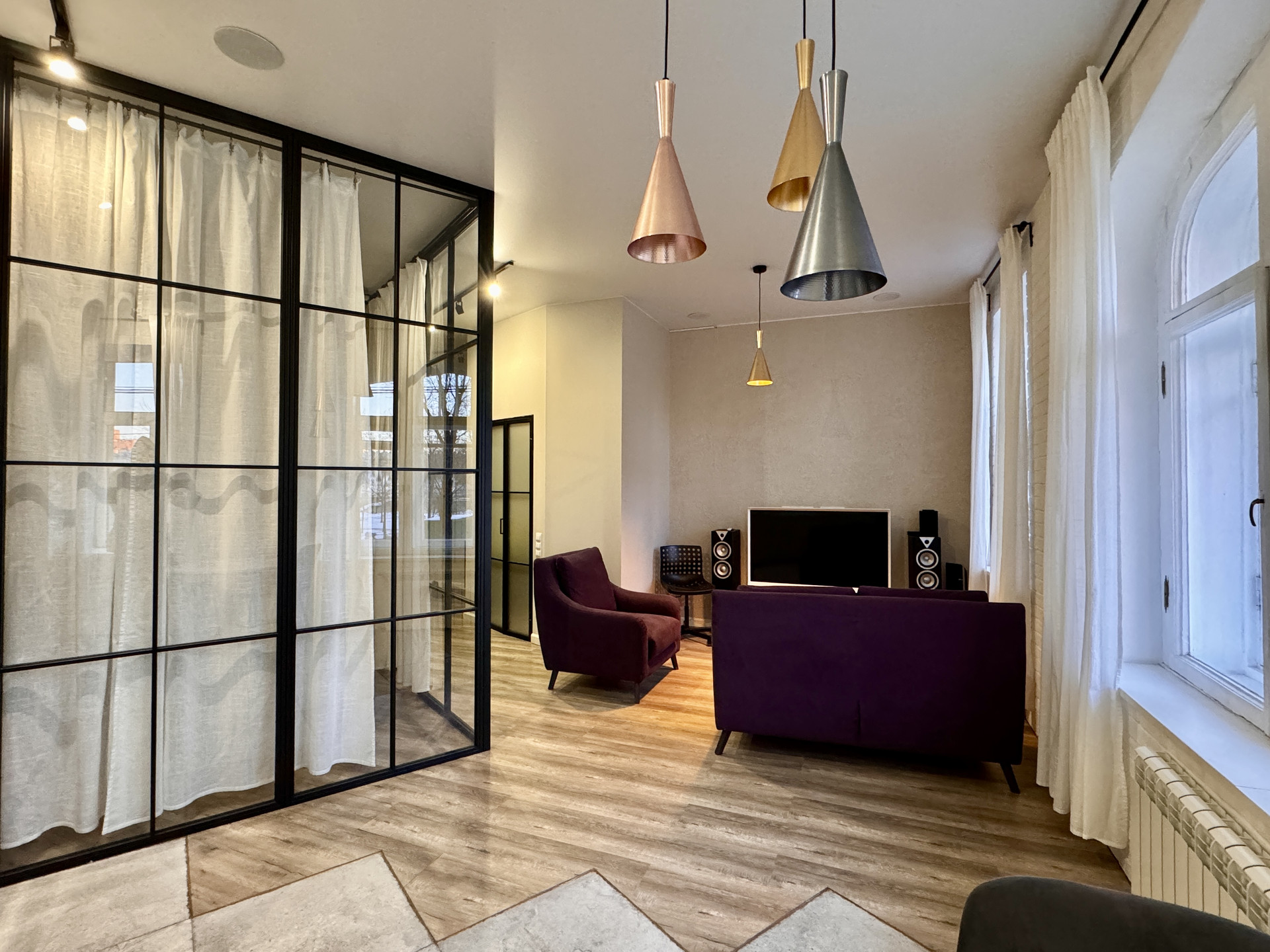 Высокие потолки 3,3 метра. На окнах современные стеклопакеты (кроме центрального окна, где сохранили деревянные двойные рамы, чтобы не потерять интересную расстекловку).