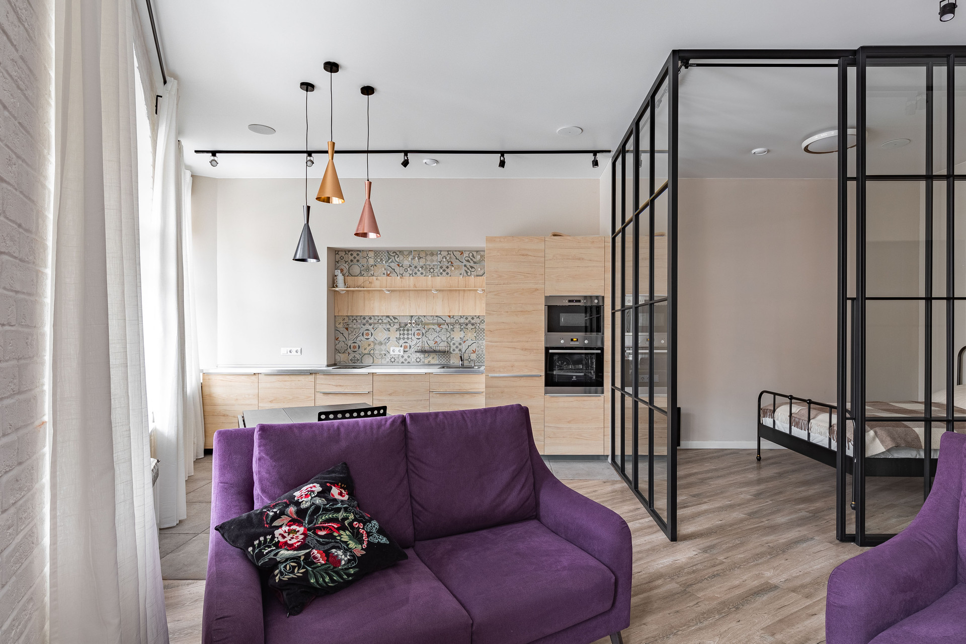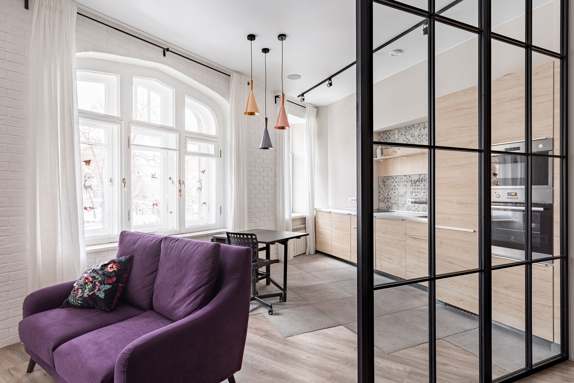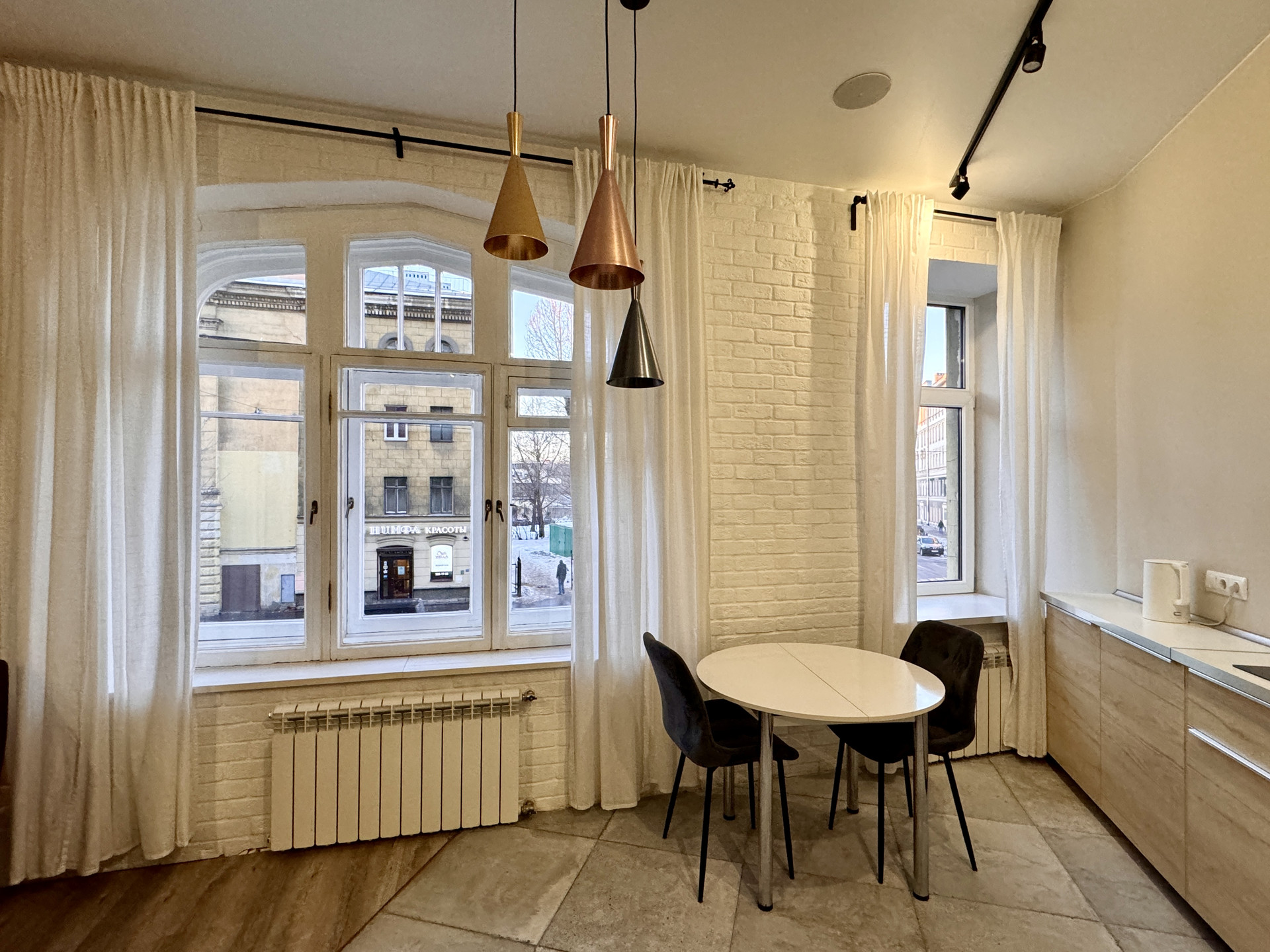 -пространство кухни-гостиной возле окон, все в видом на улицу