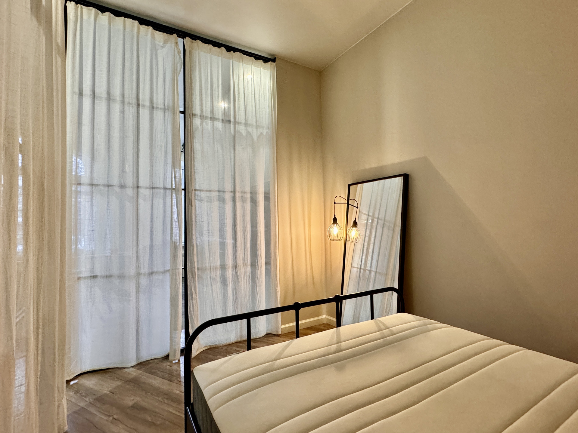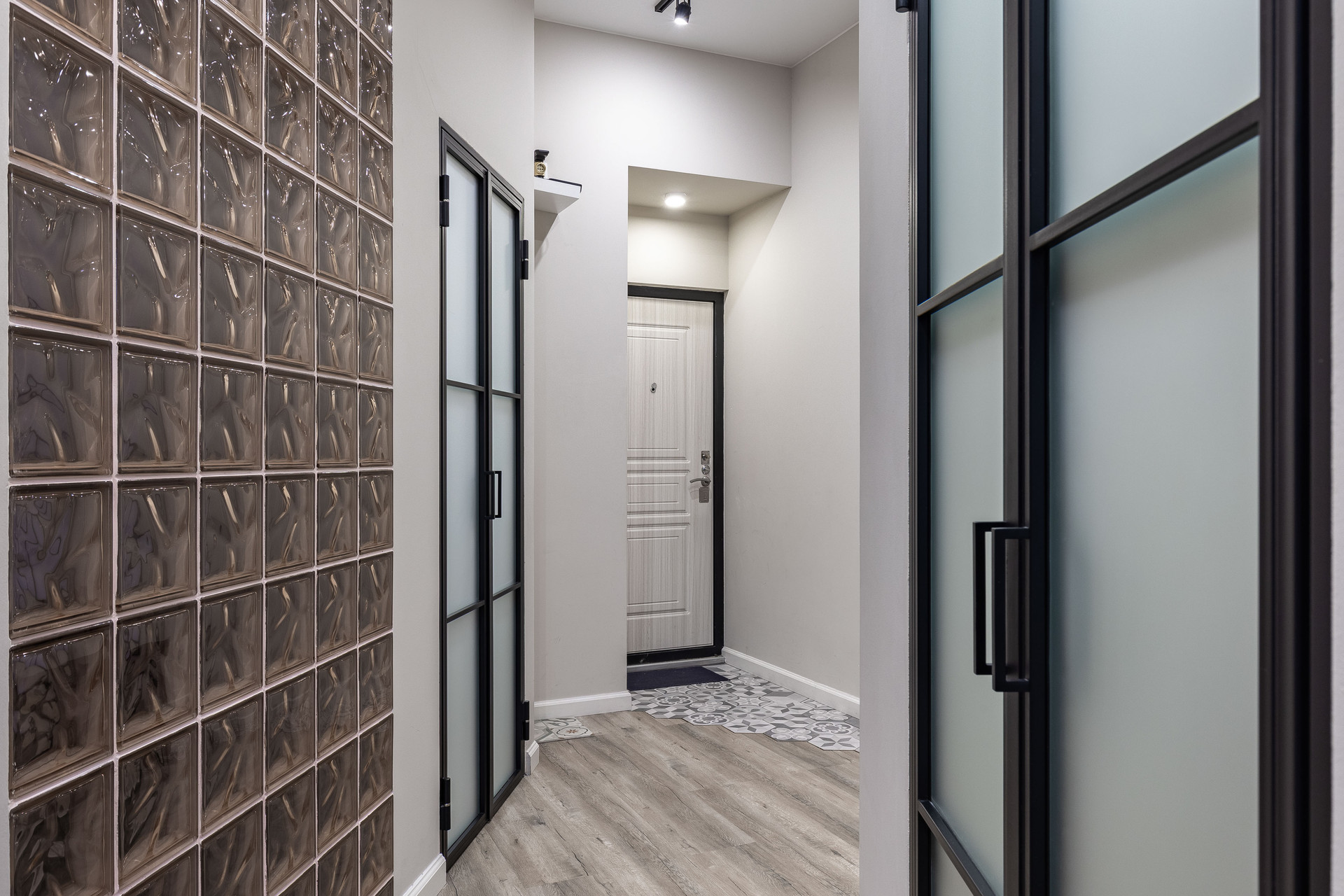 -за полупрозрачной перегородкой из стекла и металла спальная комната с двуспальной кроватью.