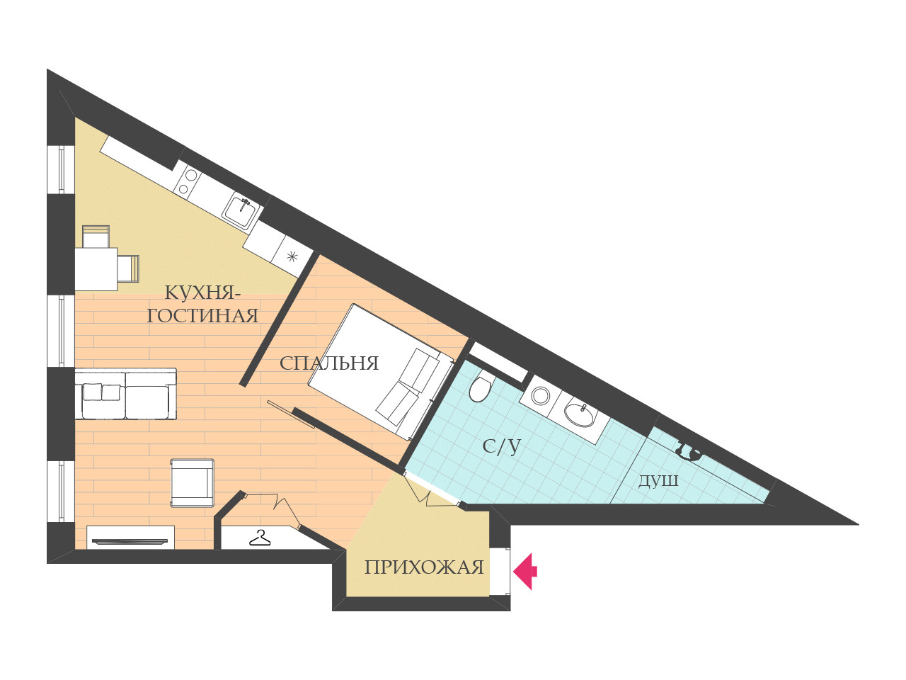 -совмещенный санузел, в зоне душевой сделан отрицательный уклон, благодаря чему не нужна шторка,