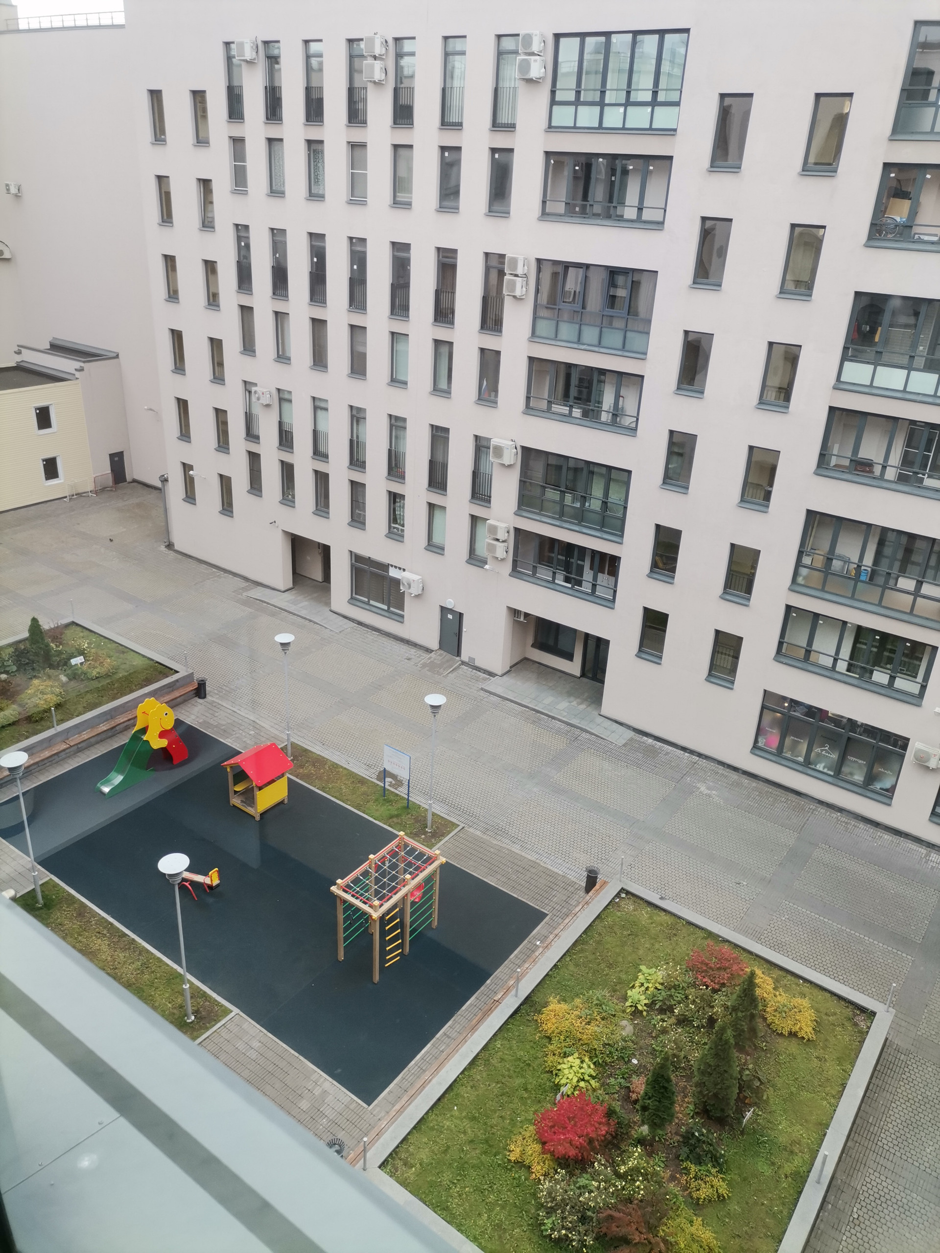 В доме есть несколько супермаркетов. В закрытом дворе разбиты зелёные газоны с цветочными клумбами и установлены удобные скамейки. Красивое освещение внутреннего закрытого двора, круглосуточный мониторинг состояния инженерных систем здания. Видеонаблюдение, круглосуточная охрана позволят со спокойным сердцем оставлять Вашего ребенка на детской площадке для игр.