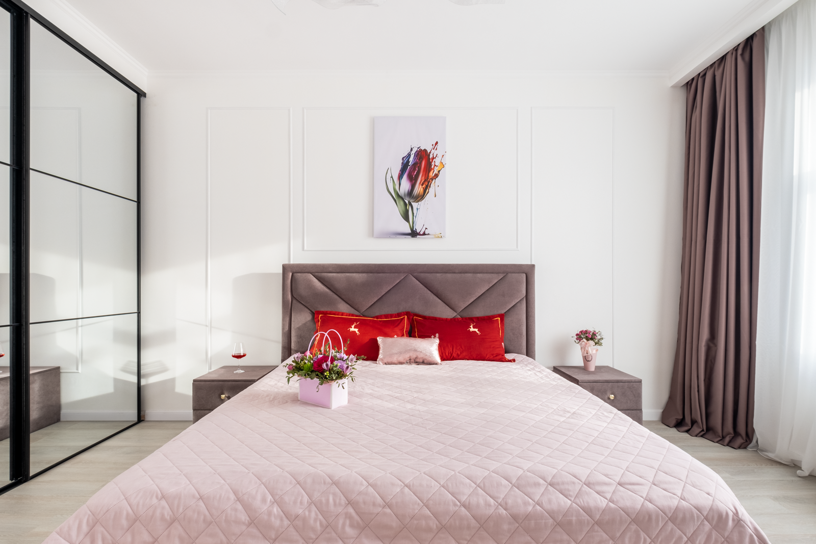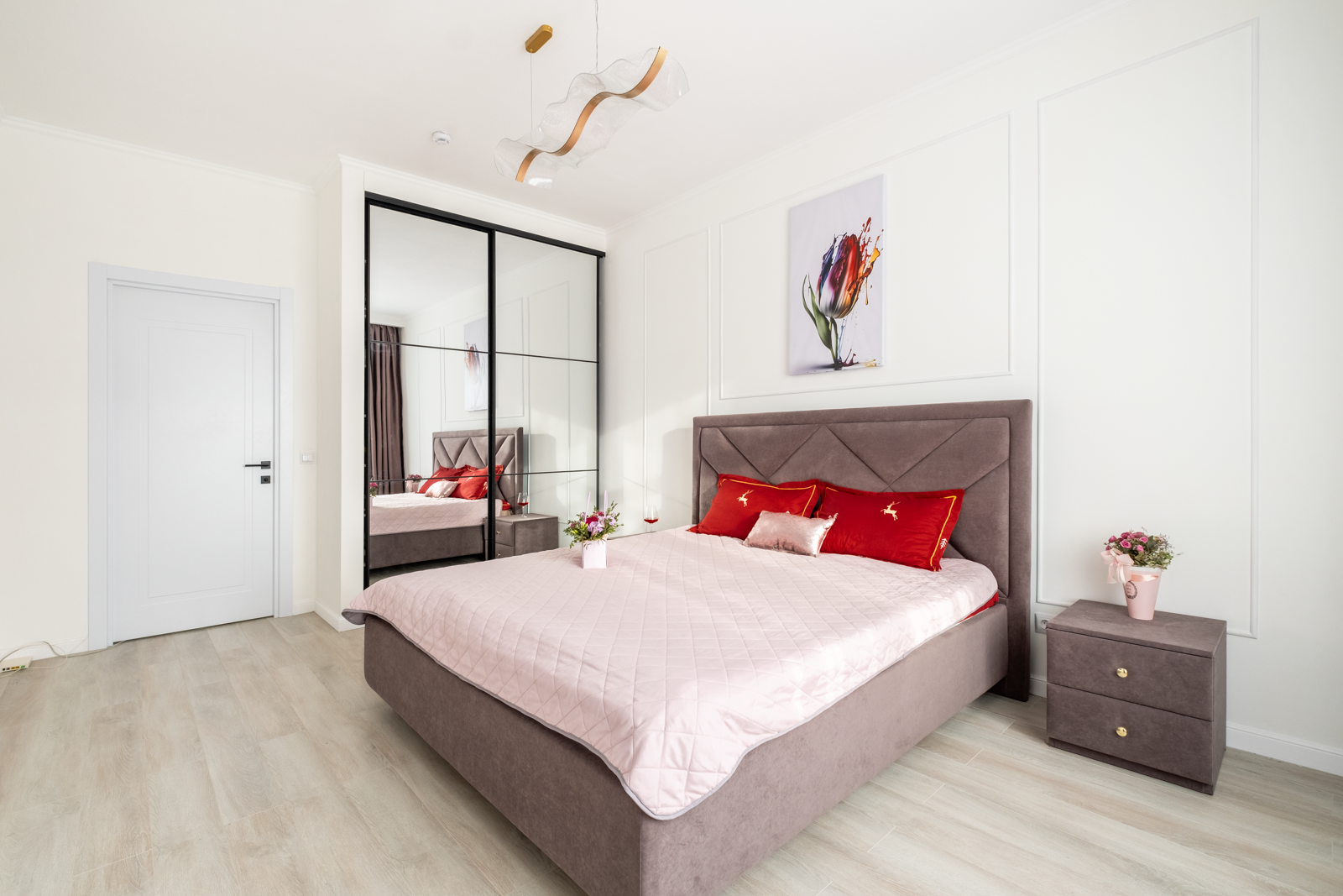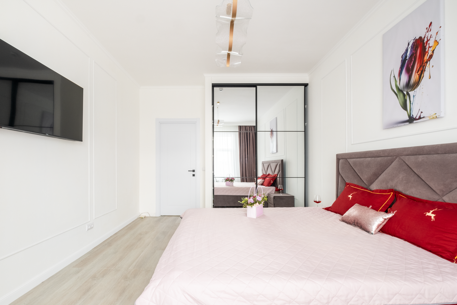 В спальне располагается новая кровать с ортопедическим матрасом, 2 прикроватные тумбы, вместительный шкаф, новый умный ТВ на кронштейне. С высокого этажа открывается прекрасный вид из окна на новый жилой квартал и южную часть города.