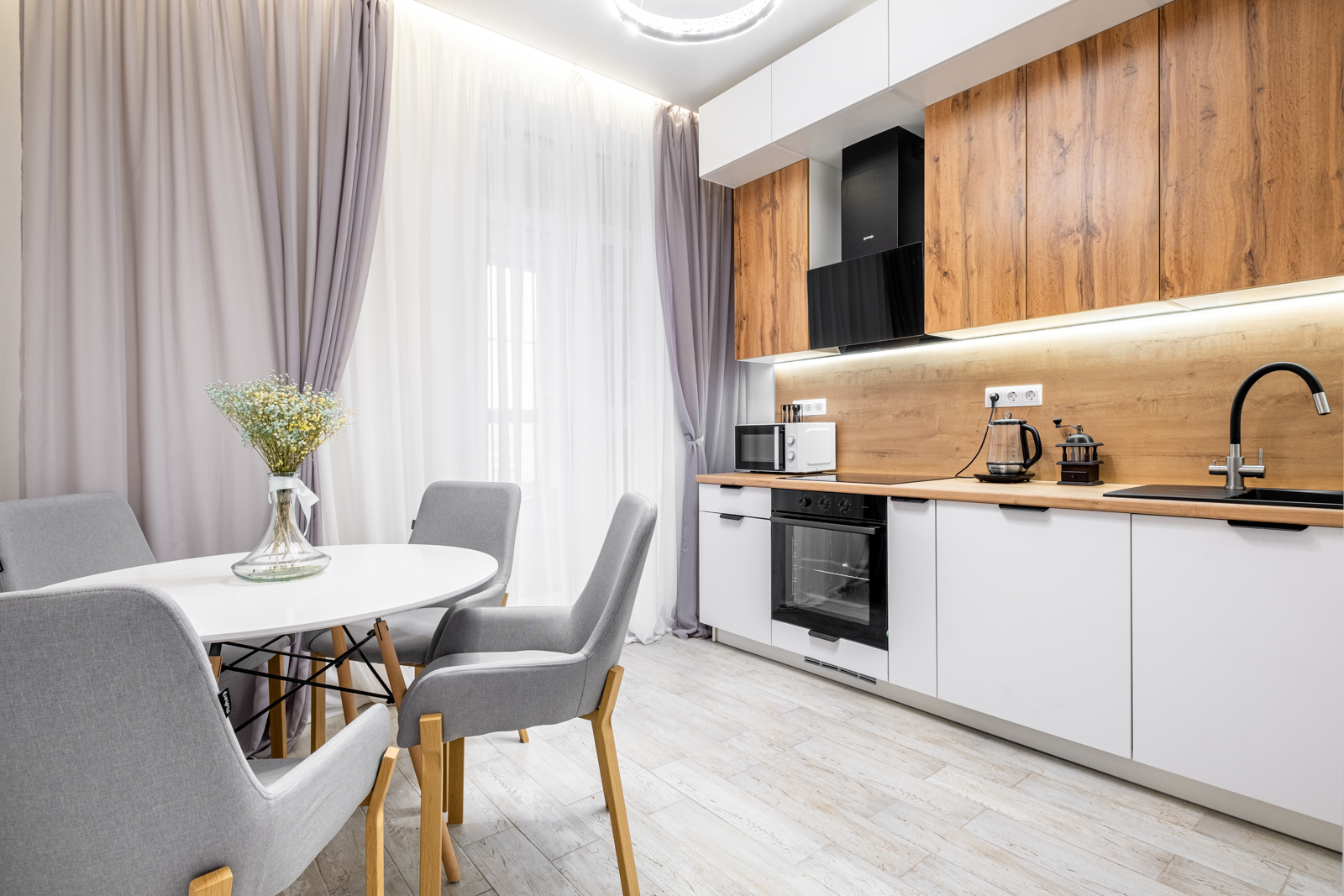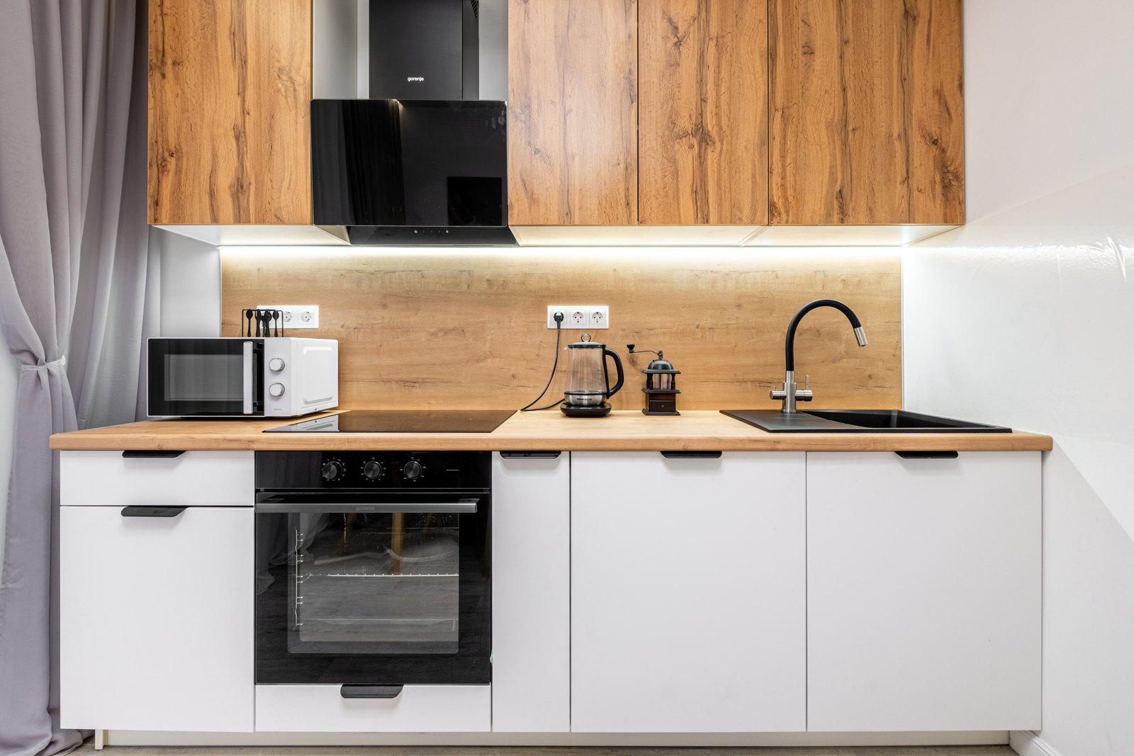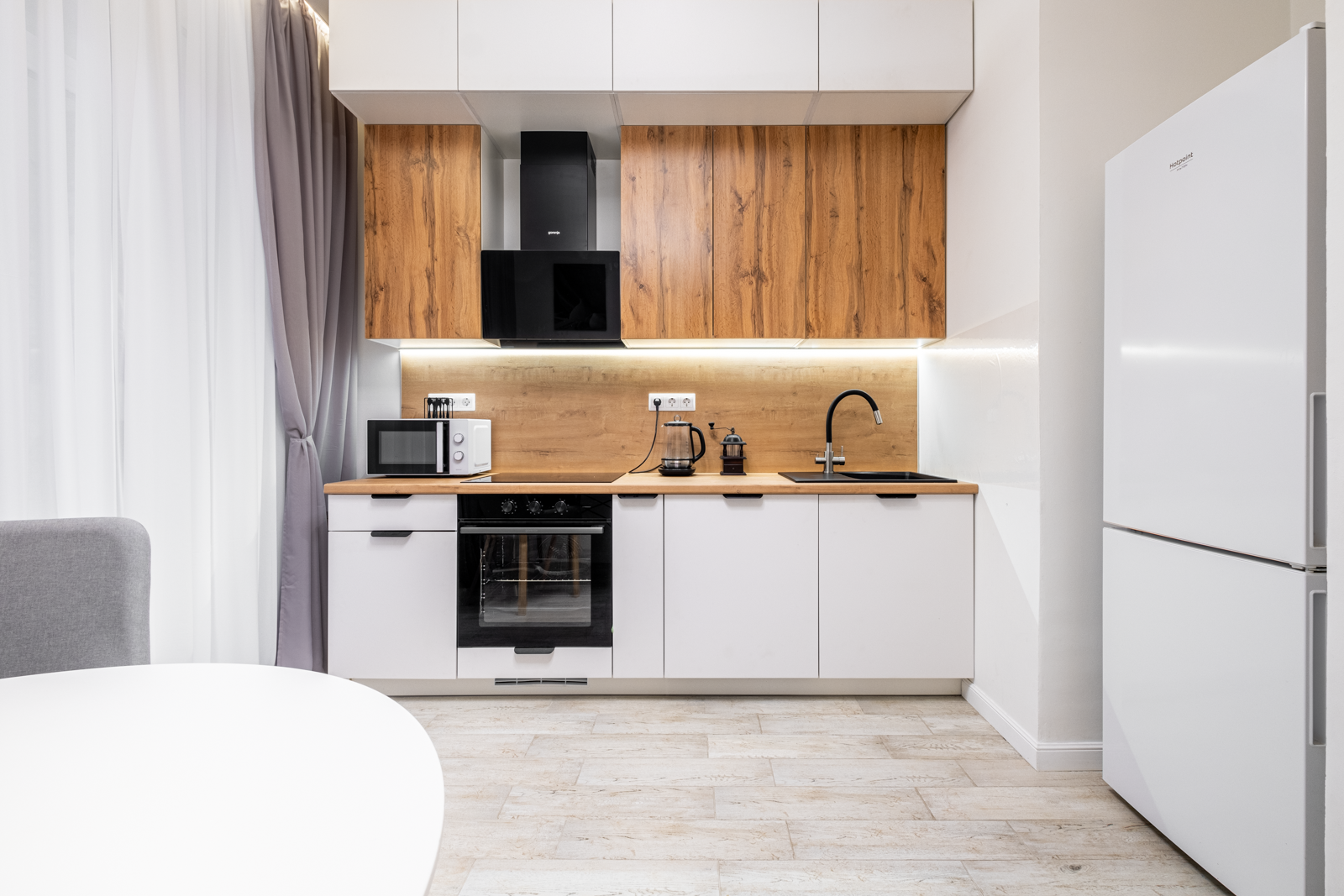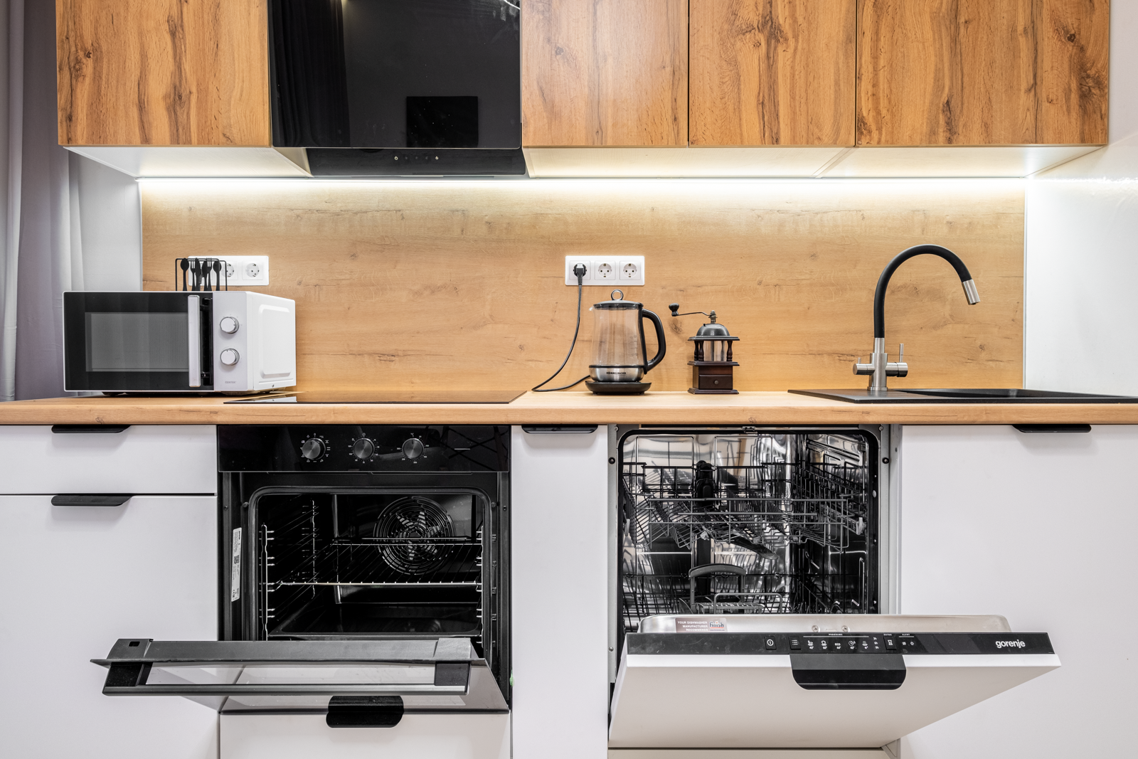 Немецкая кухня на доводчиках, холодильник Hotpoint Ariston, варочная панель и духовой шкаф Gorenie, широкая посудомоечная машина и кухонная вытяжка Gorenie, стиральная машина 9кг с сушкой LG. Всё новое и на гарантии.