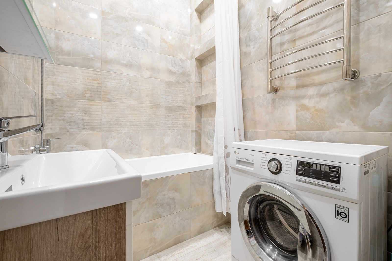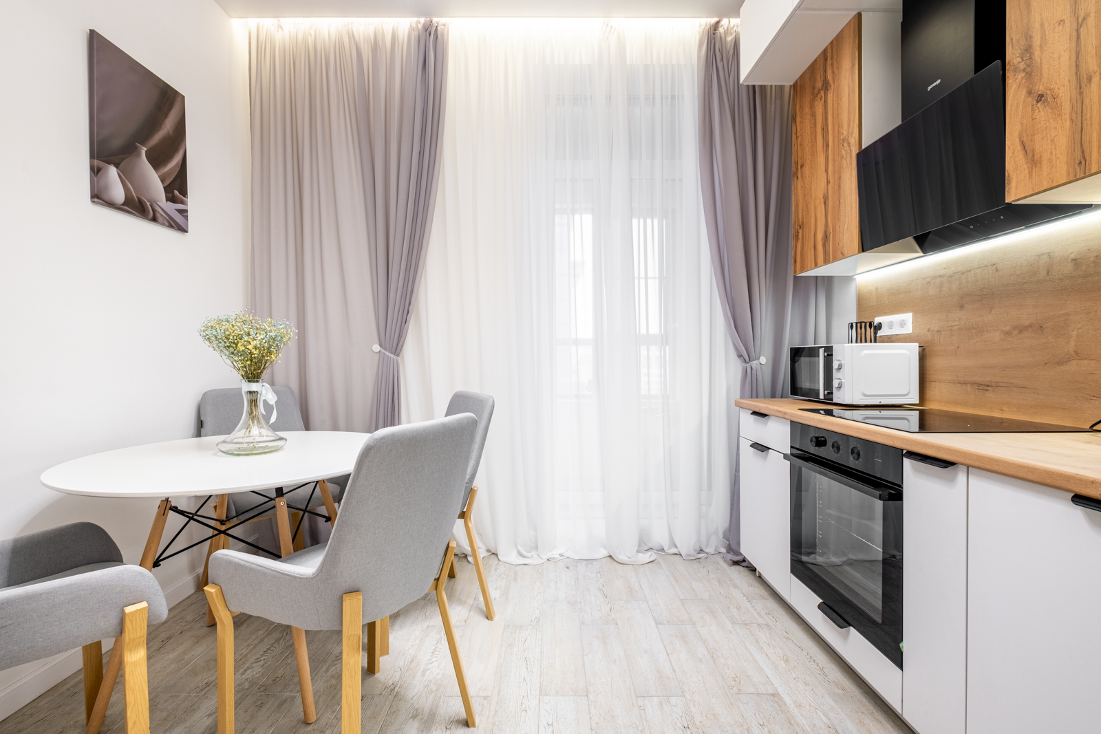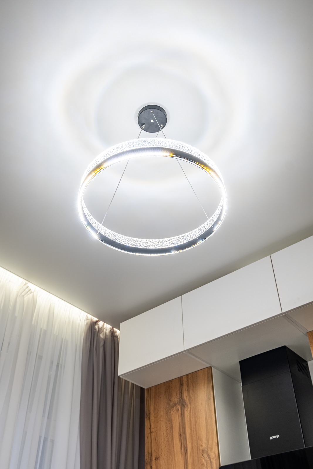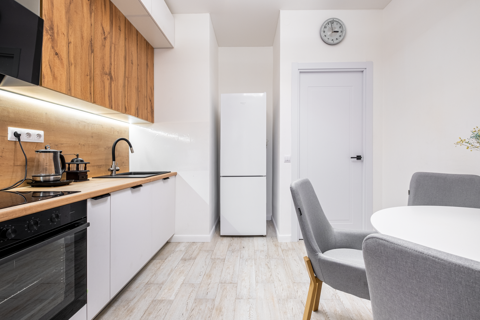 Немецкая кухня на доводчиках, холодильник Hotpoint Ariston, варочная панель и духовой шкаф Gorenie, широкая посудомоечная машина и кухонная вытяжка Gorenie, стиральная машина 9кг с сушкой LG. Всё новое и на гарантии.
