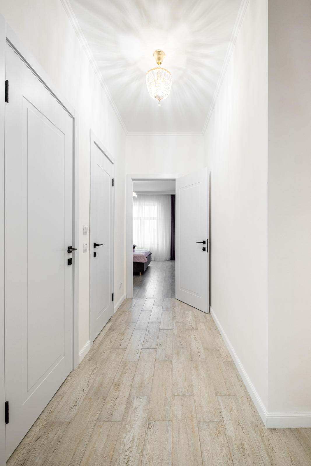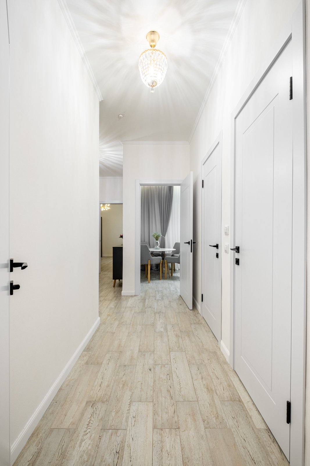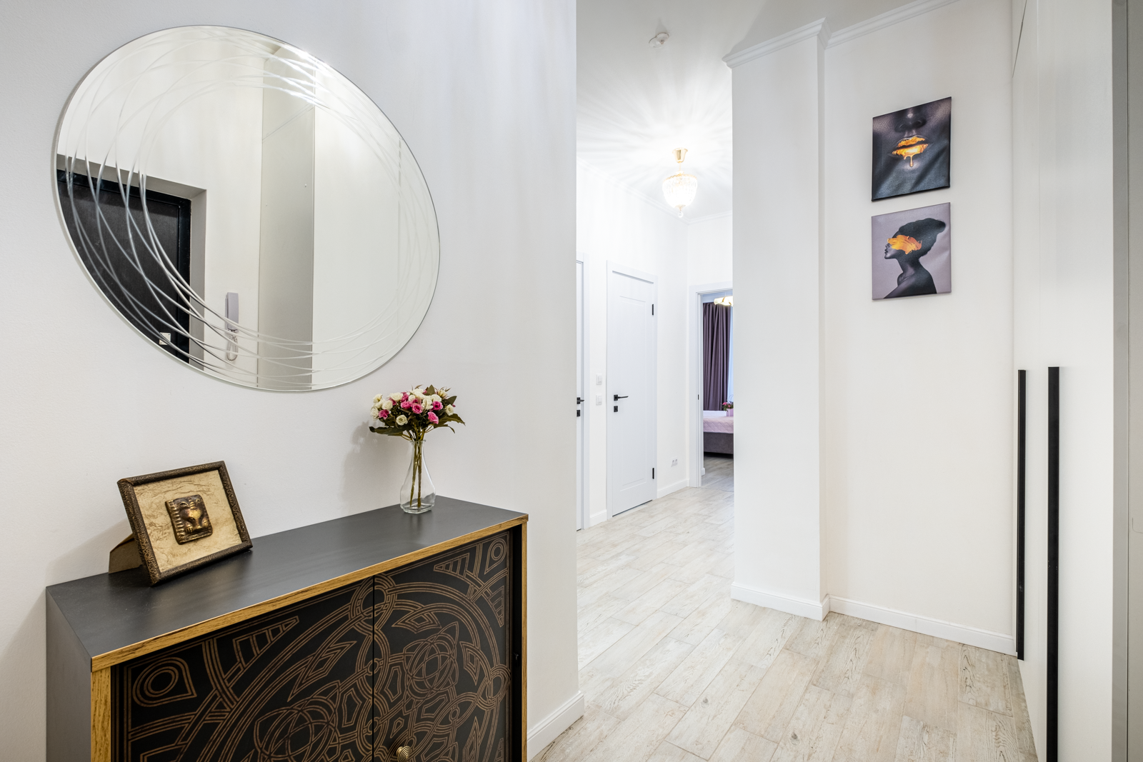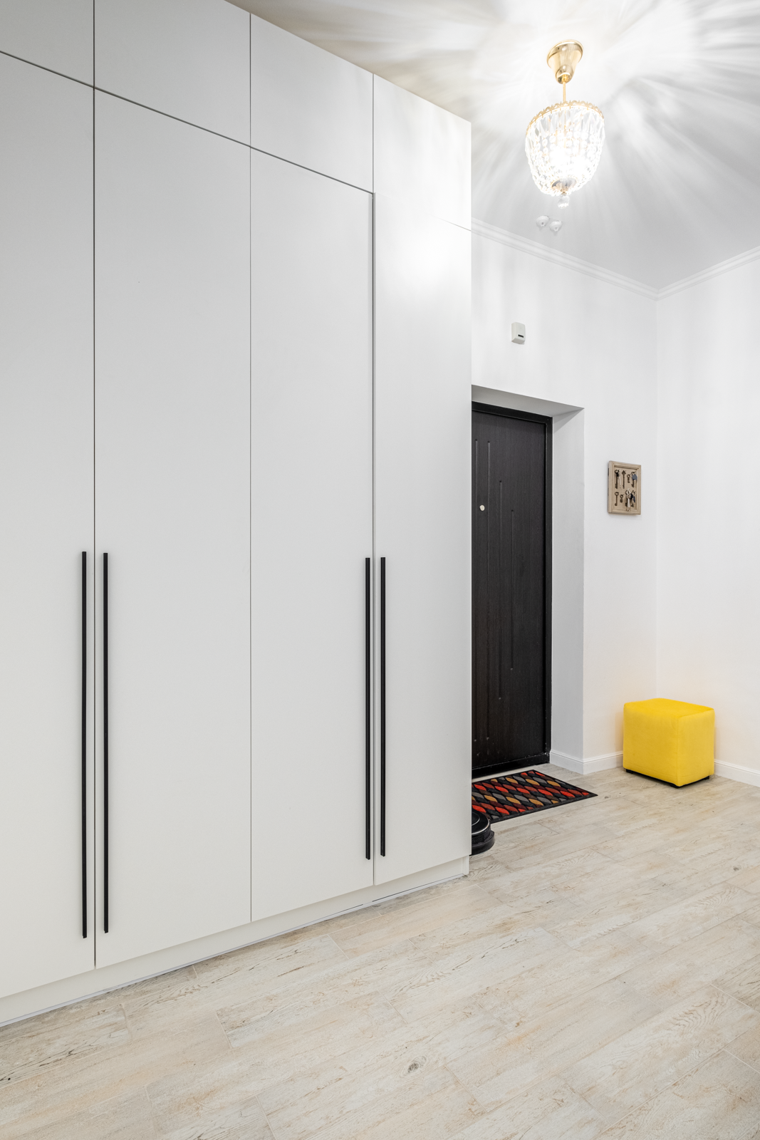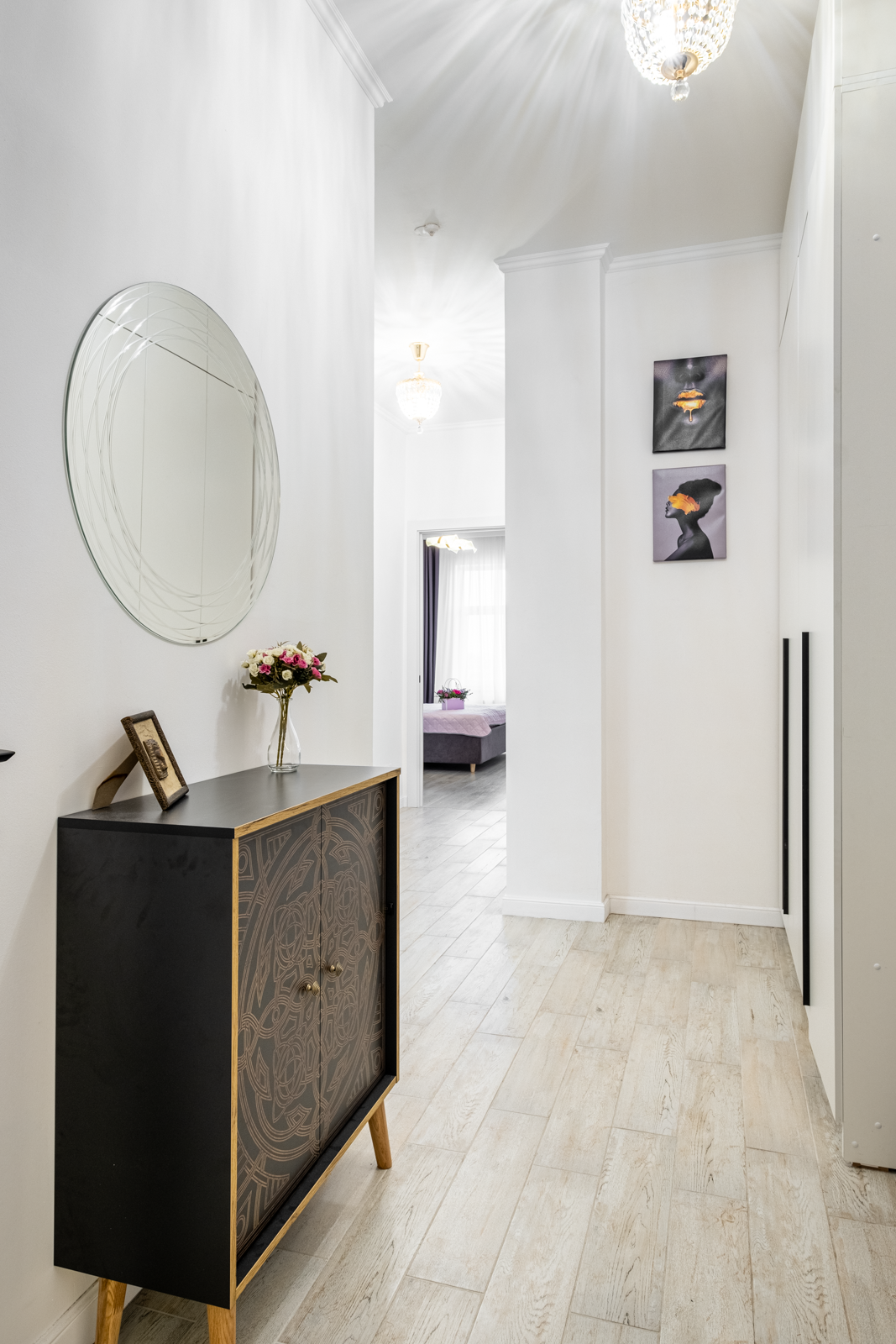 В коридоре удобная система хранения, на потолке 2 хрустальные позолоченные итальянские люстры. Во всей квартире детально продумано освещение, сделаны дополнительные светодиодные подсветки.