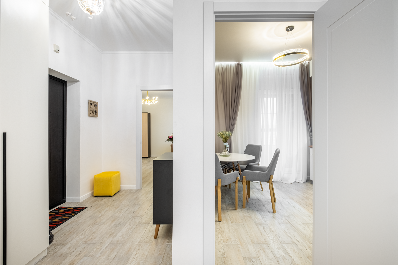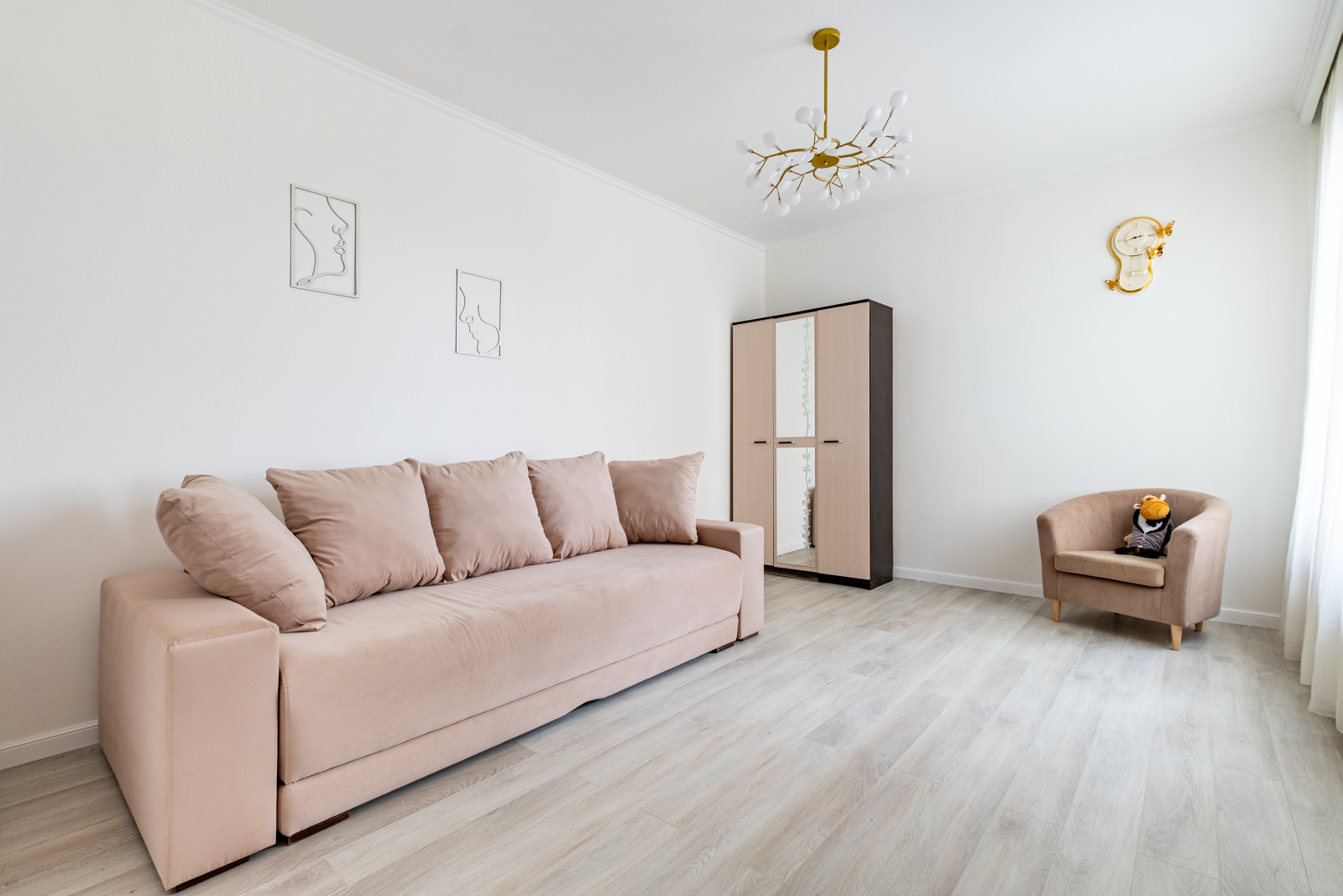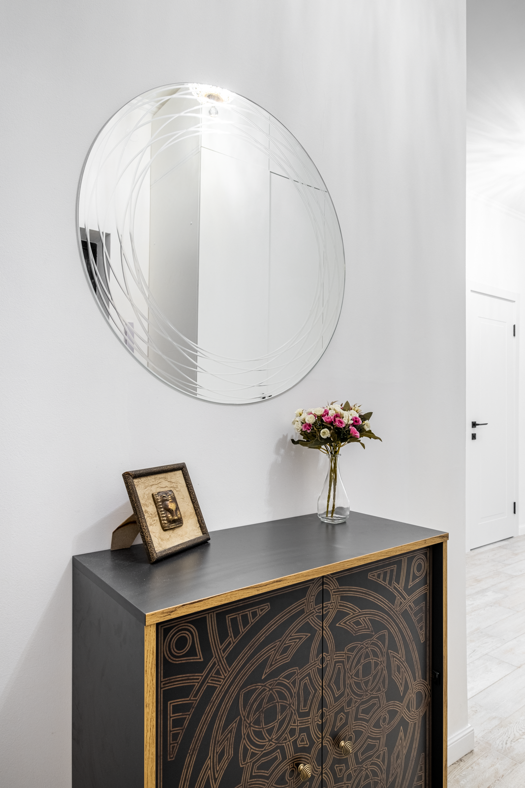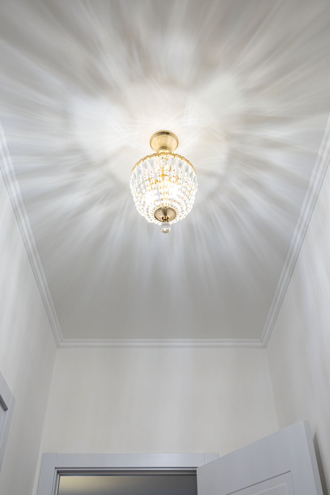 В коридоре удобная система хранения, на потолке 2 хрустальные позолоченные итальянские люстры. Во всей квартире детально продумано освещение, сделаны дополнительные светодиодные подсветки.