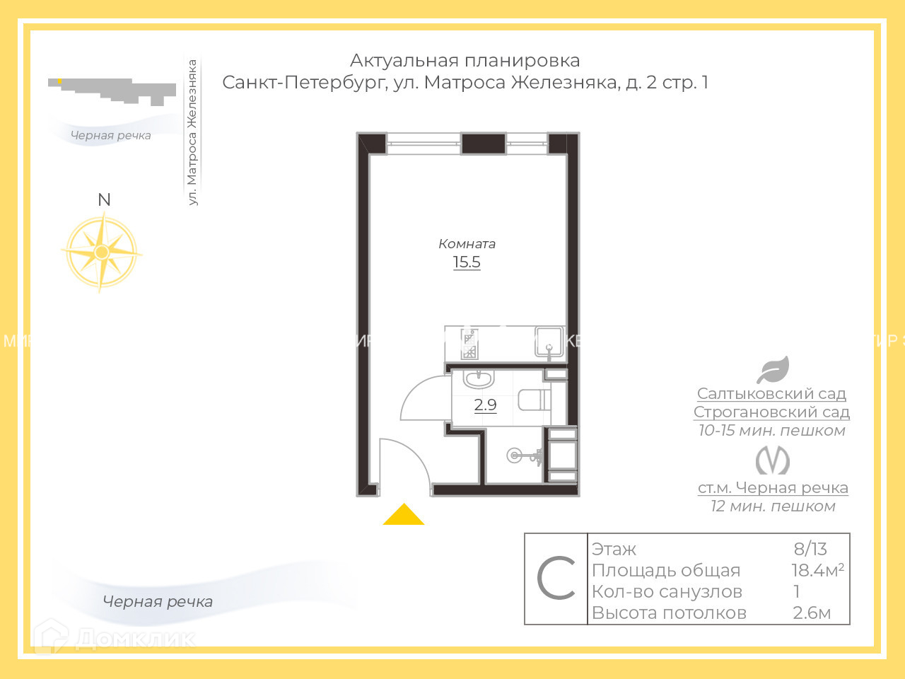 Квартира студия, 18.4 м2, этаж 8 / 13, на продажу в Санкт-Петербурге, улица Матроса Железняка, 2