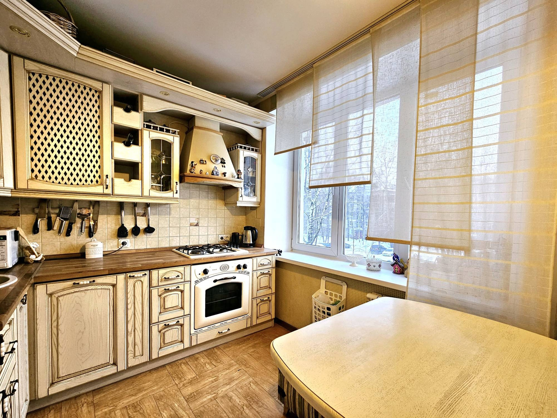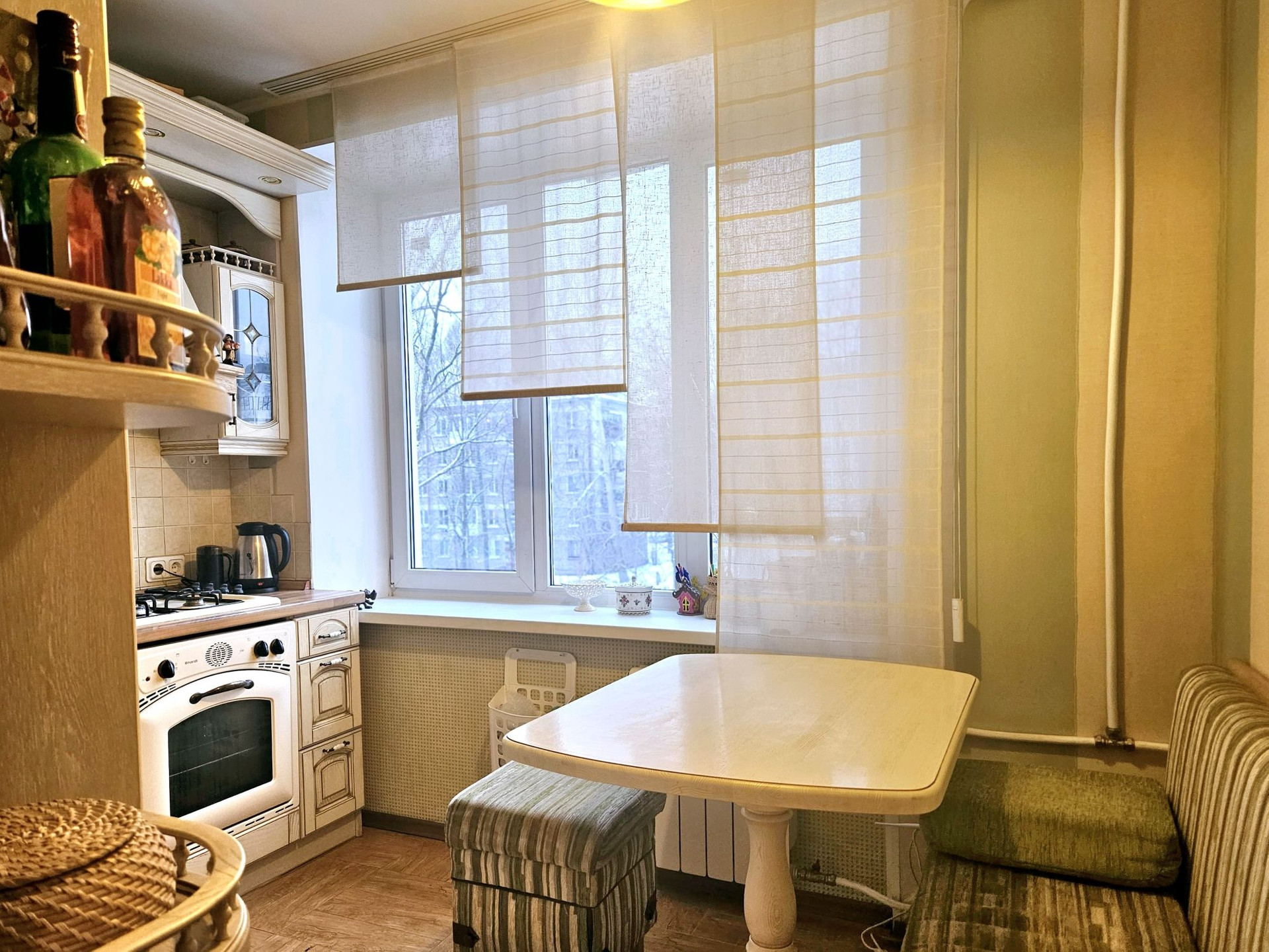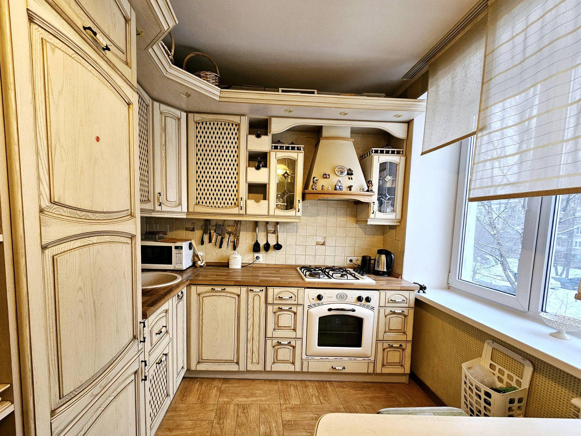Техника:встроенный холодильник liebherr немецкой сберки,стиральная машинка Electrolux, встроенная помудомоечная машинка Bosch, газовая колонка Bosch-неь проблем с горячей водой, газовые варосная поверхность и духовой шкаф.
