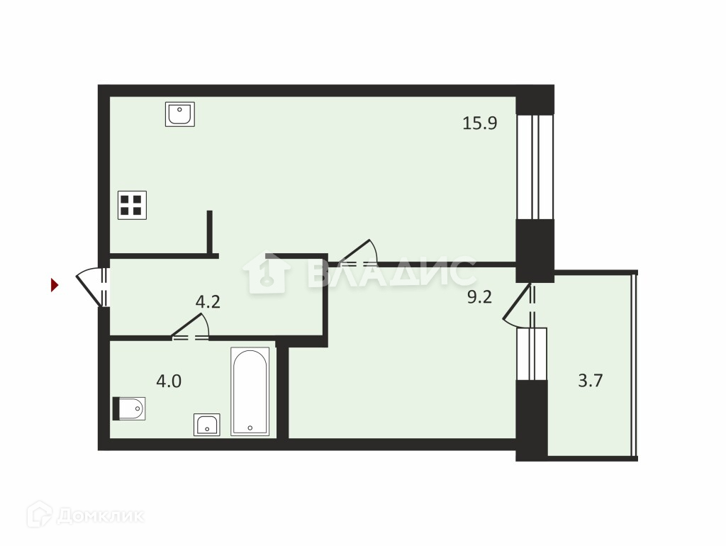 Общая площадь 33.3 м2