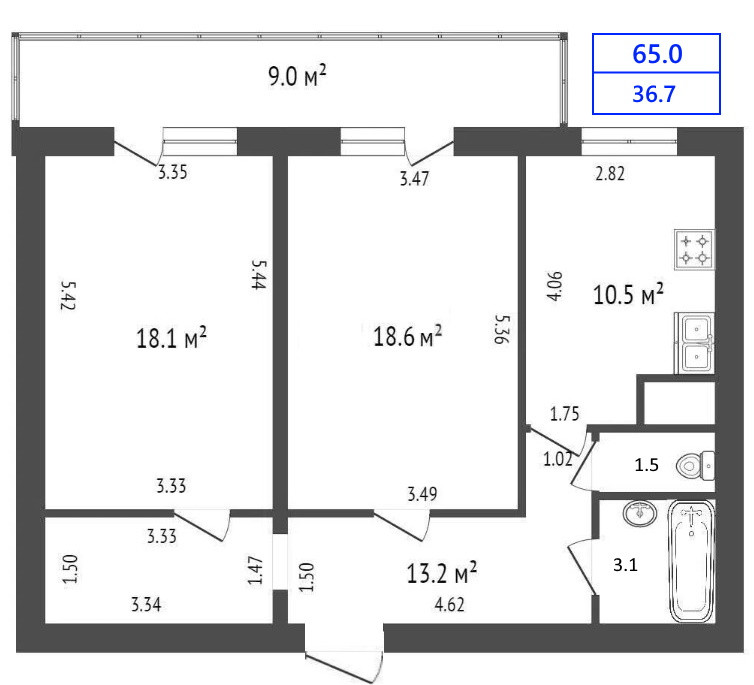 Жилая площадь 36.7 м2
