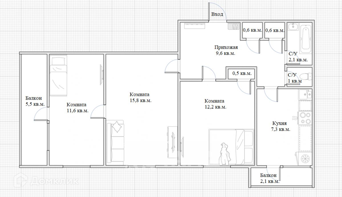Жилая площадь 39.6 м2