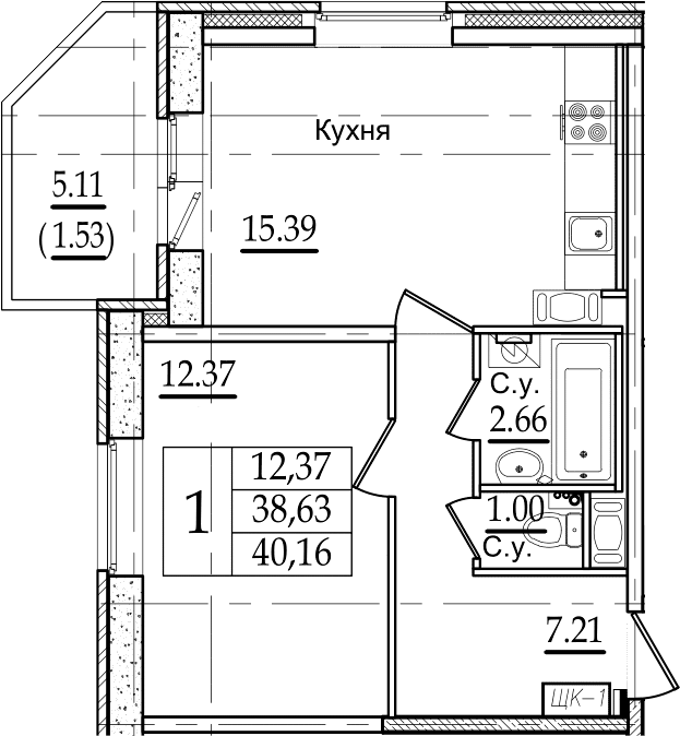 Общая площадь 40.16 м2
