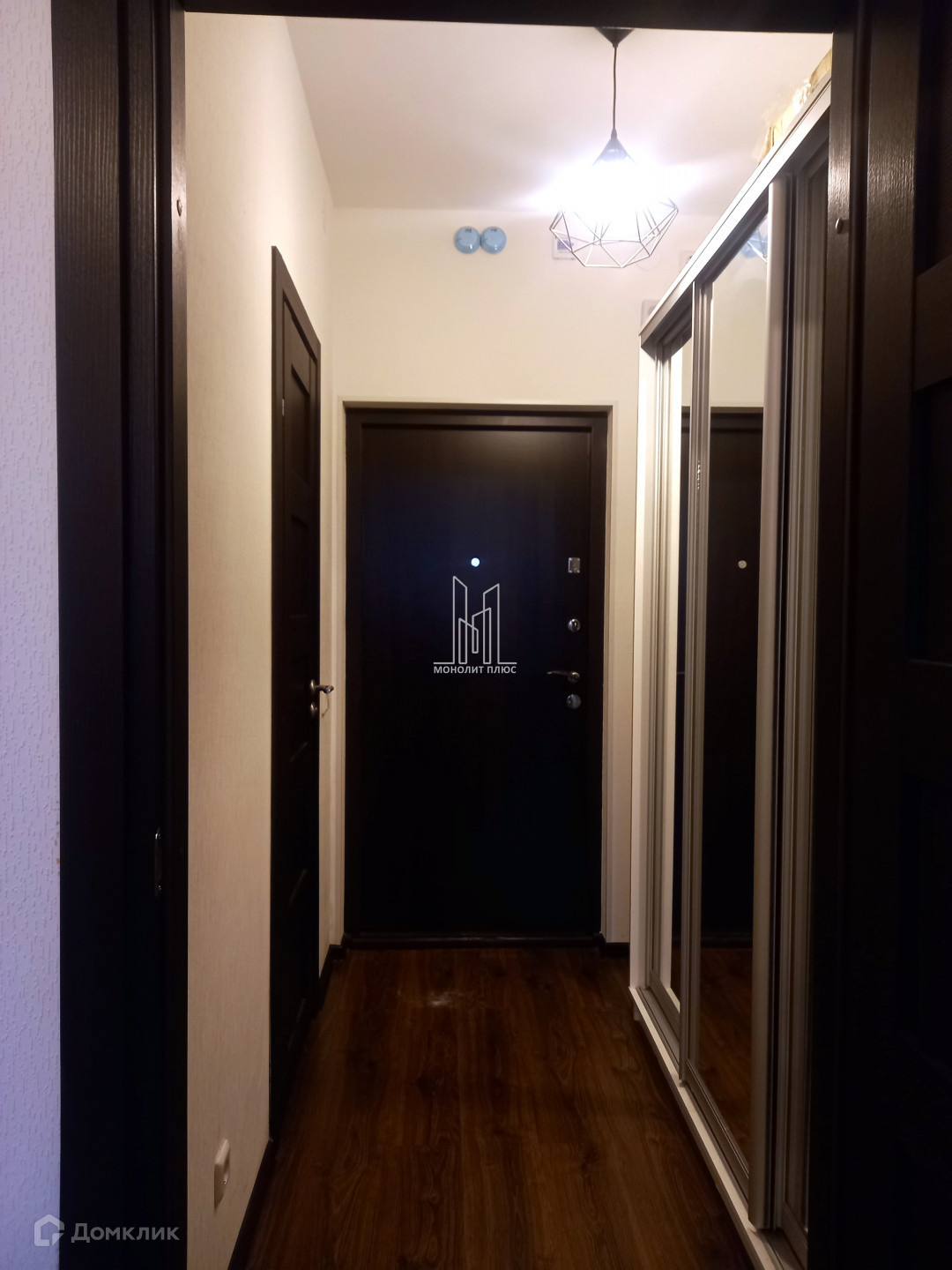 Отделка в квартире от застройщика Setl Group: в комнате и коридоре ламинат. В санузле на стенах и на полу керамическая плитка, пол с гидроизоляцией. Межкомнатные двери МДФ, цвет "Венге".