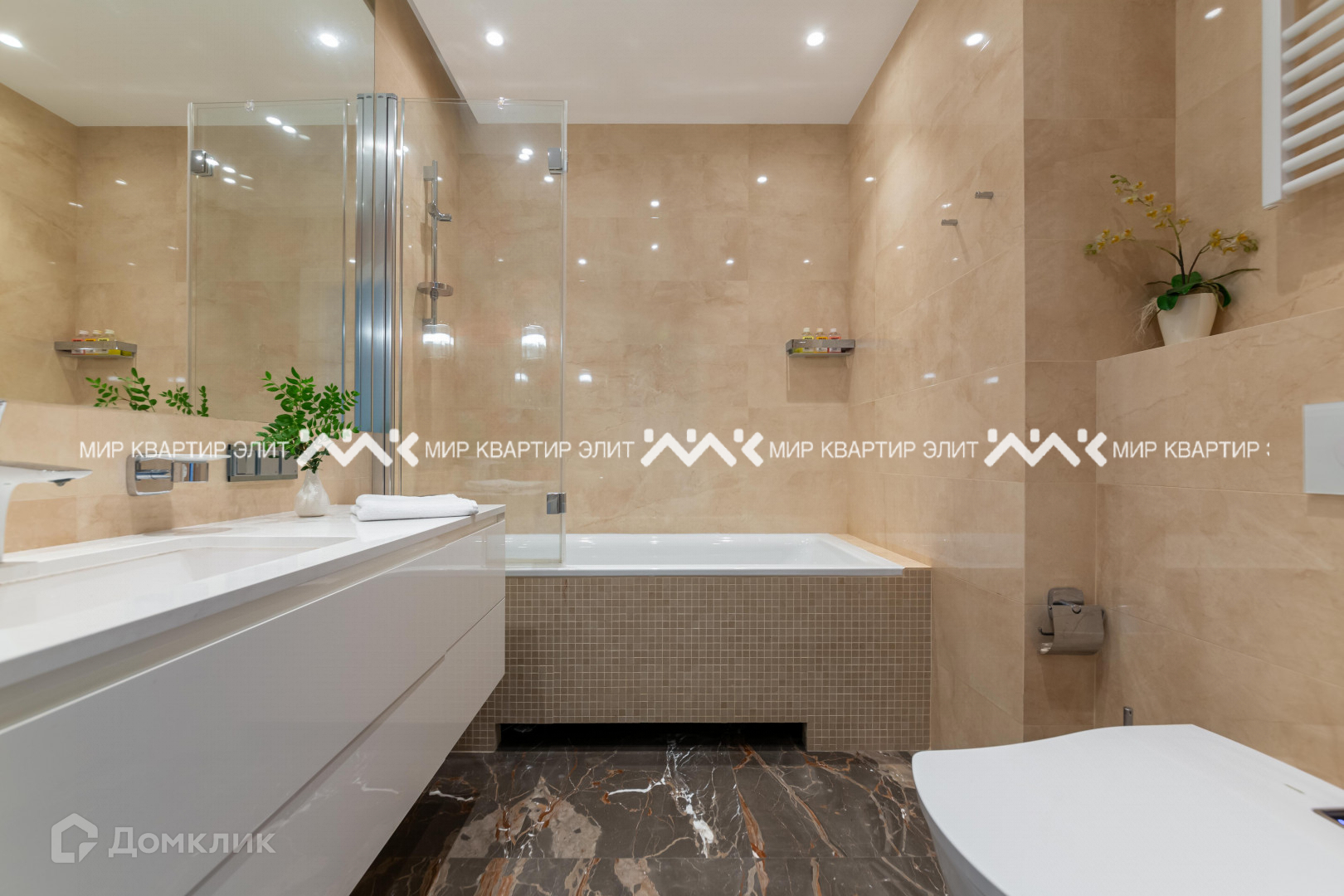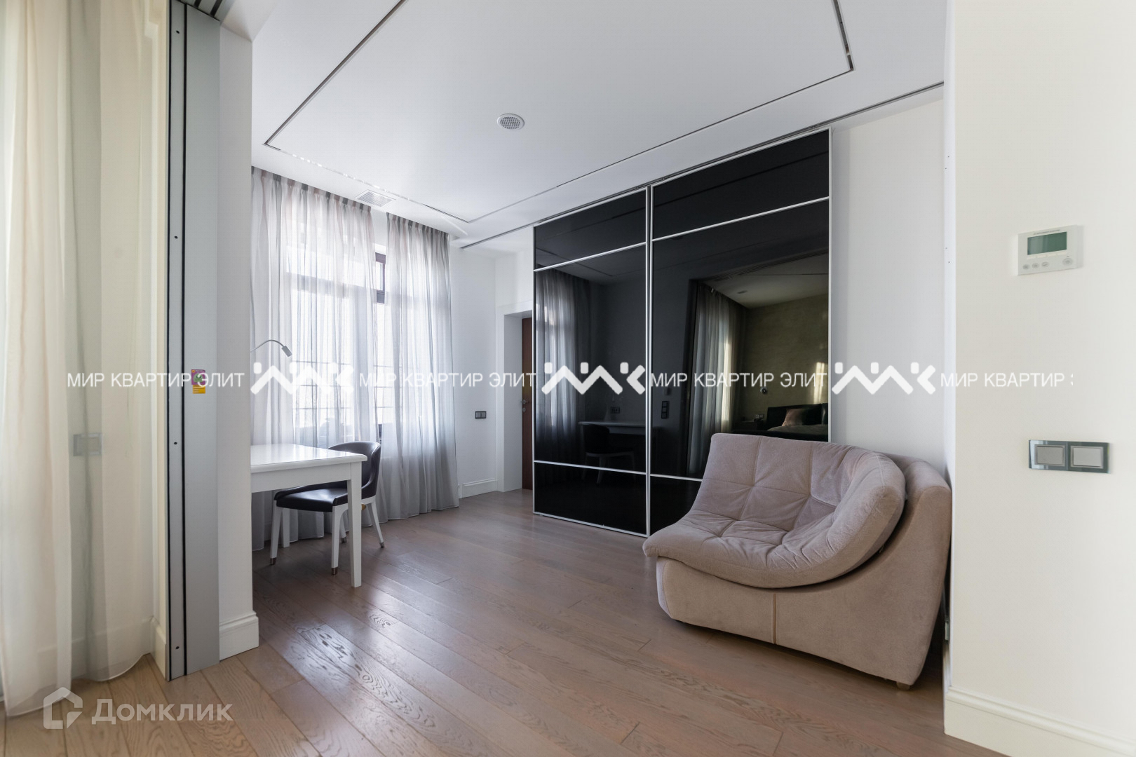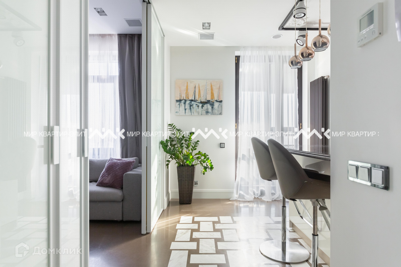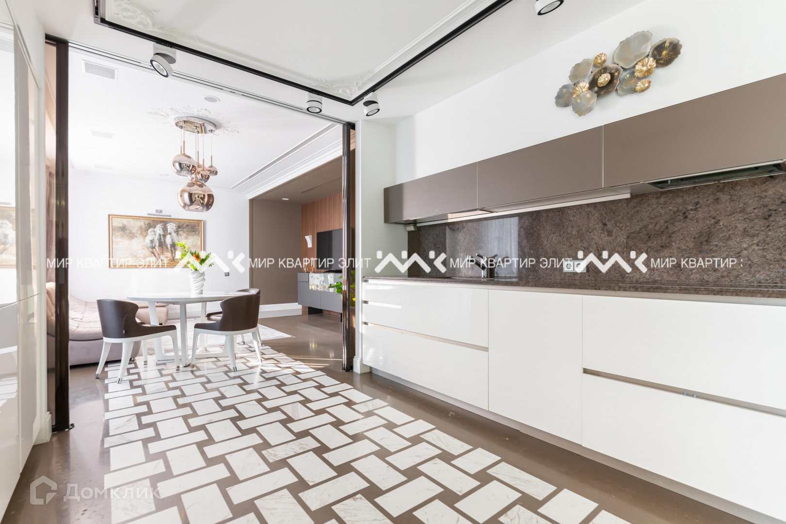 Интерьер сделан из брендированных материалов мрамора, дуба, венского шпона. Окна деревянные. Предметы освещения, отопления завозились из Италии. Сантехника производства Японии. Двери Италия. Бытовая техника Швейцарской компании ZUG. Большая часть мебели делалась на заказ. Так же во всей квартире сделана качественная система вентиляции (умный дом), которая отвечает за охлаждение, увлажнение, обогрев и осушение. Зонирование площади максимально продумано и эргономично, в одной части квартиры находится детская зона, в противоположной взрослая, в центре гостевая и обеденная. Потрясающие виды на город.