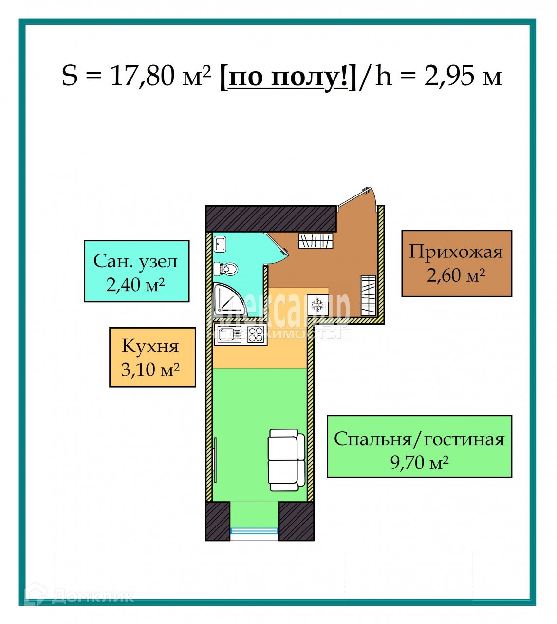 -   Площадь: 17,80 м² (общая по полу см. ПЛАН!)