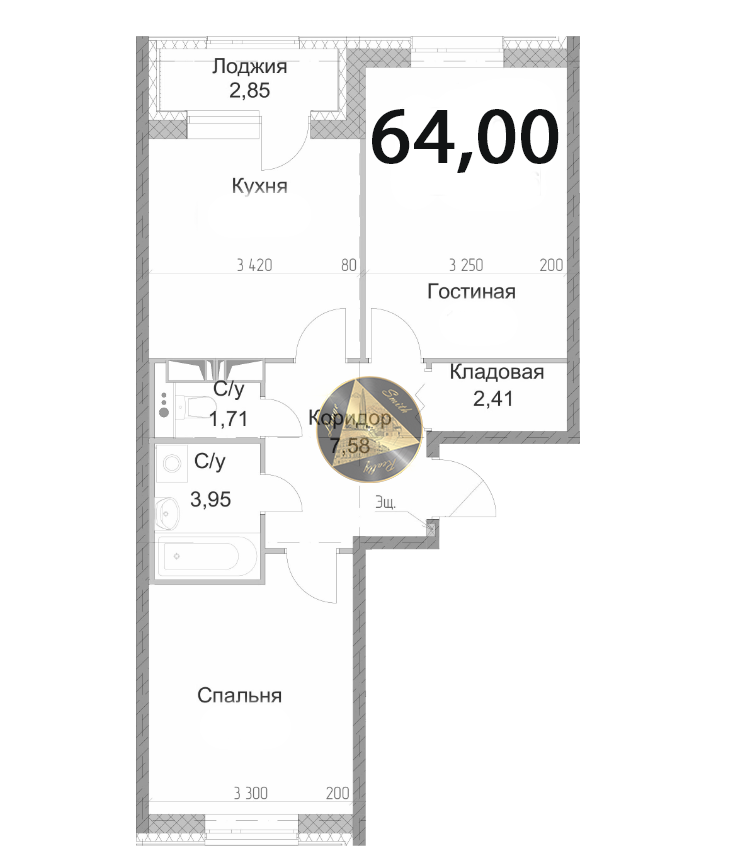 - Общая площадь квартиры 64,00 м2.