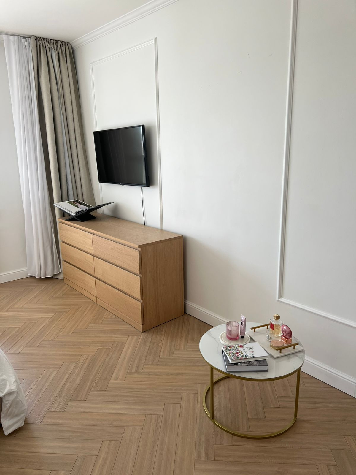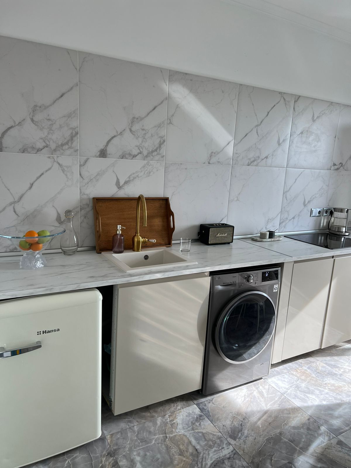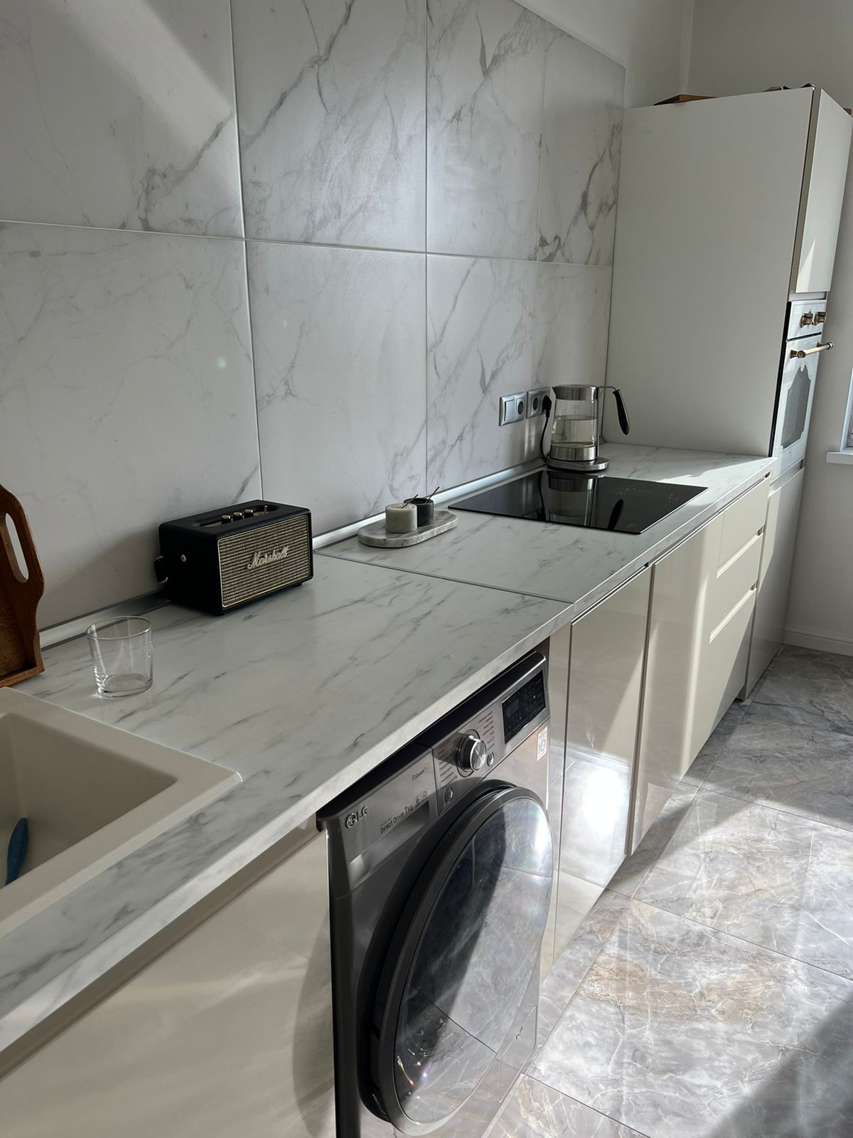 Встроенная современная техника и мебель, включая стиральную и посудомоечную машины, холодильник, телевизор, кондиционер и микроволновую печь.
