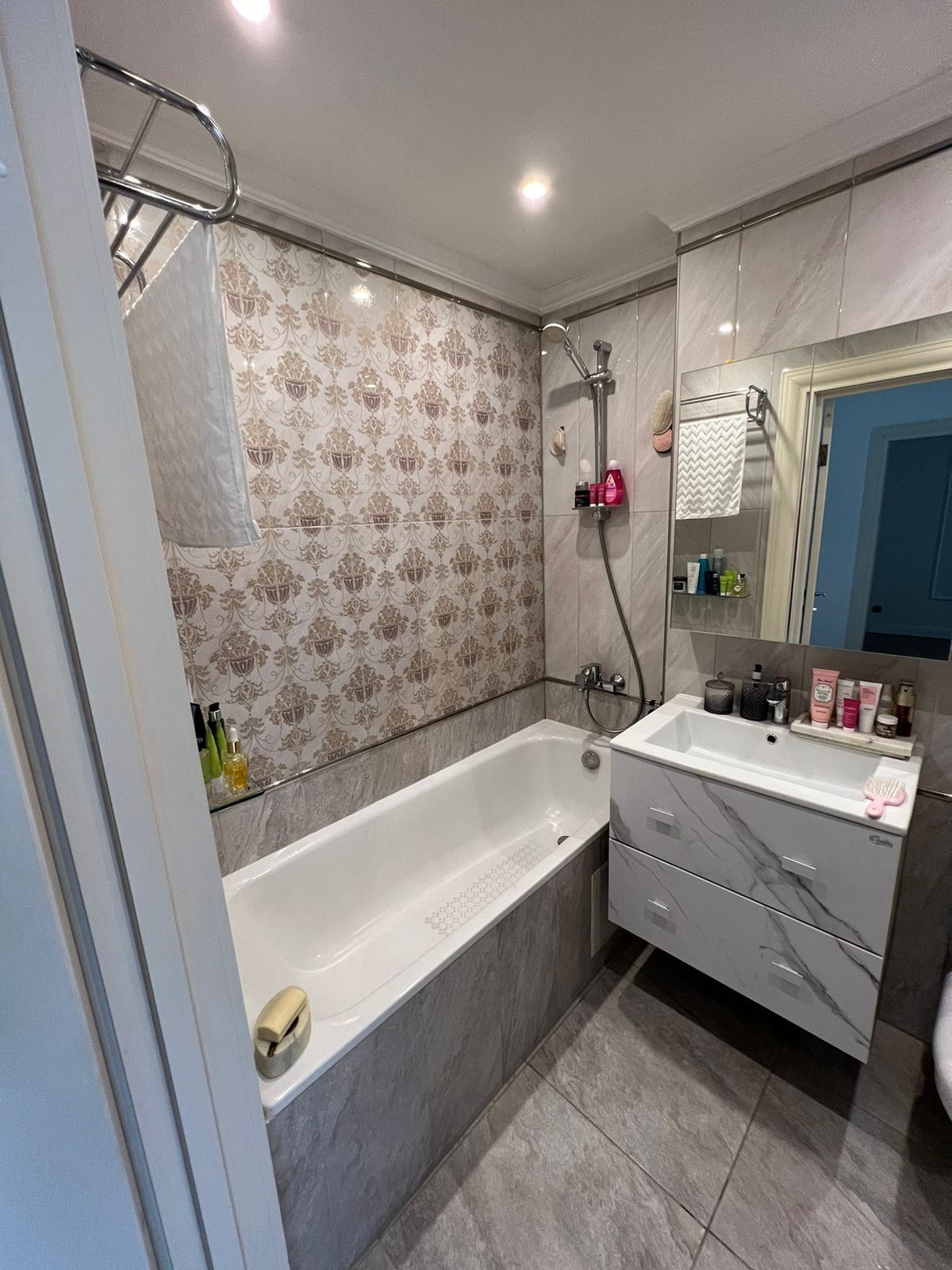 Совмещенный санузел, лоджия с панорамным остеклением.