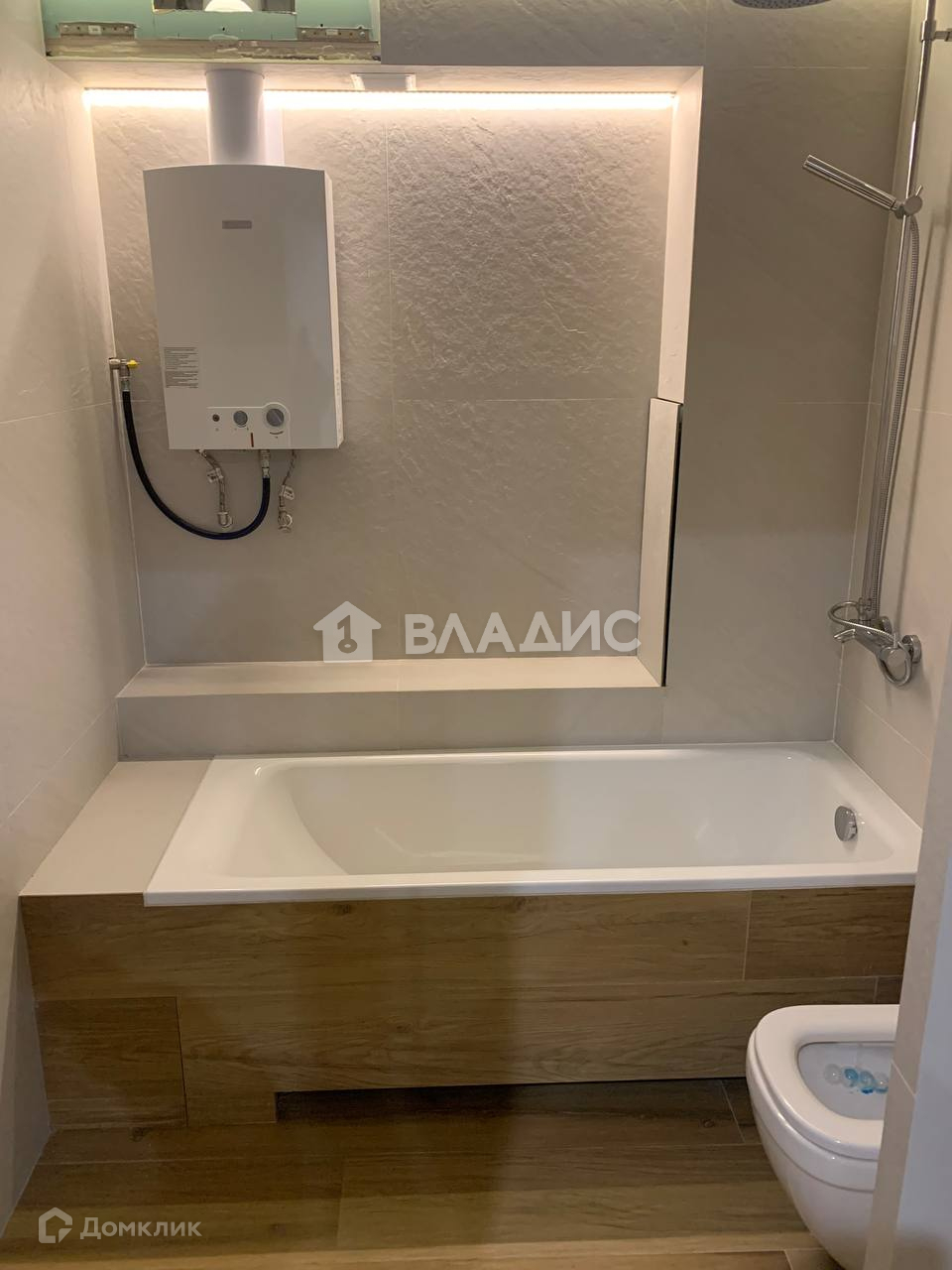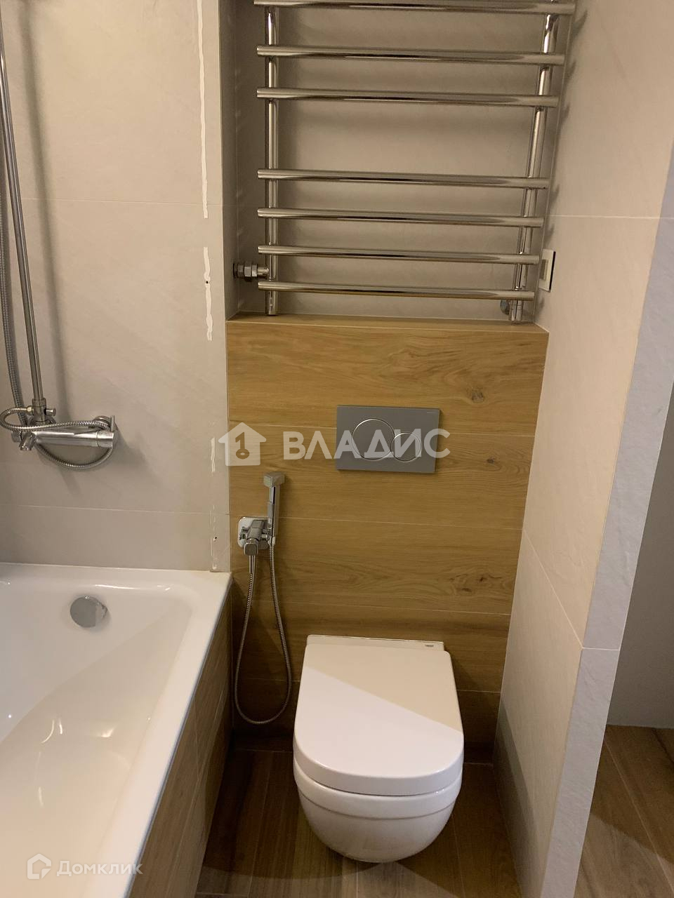 Совмещенный современный санузел 4,6 м² вмещает в себя отдельностоящую акриловую ванну, подвесной унитаз, водонагреватель. Стены ванной комнаты выложены керамической плиткой, освещение дизайнерское, пол паркетная доска.
