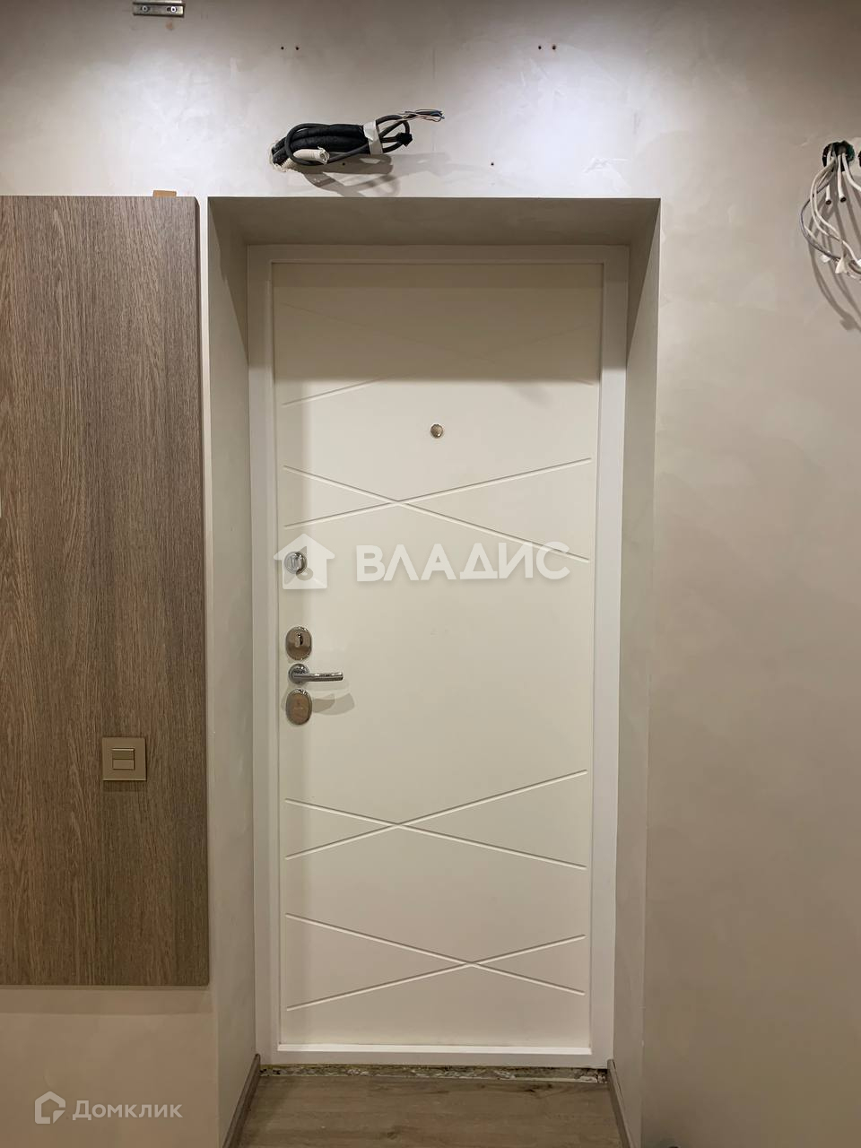 В просторном коридоре установлена стильная светлая входная дверь.