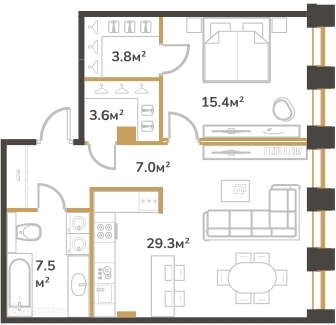 Жилая площадь 15.4 м2