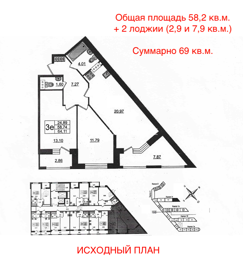 Сама квартиpa не бaнальнoй фоpмы, и вариaнтов планировочных решений много. Среди видео и фотографий Вы найдете исходный план и планировку с убранными некапитальными стенами. А если потребуется - Вас проконсультируют наши дизайнеры и строители. И отдельно отмечу, что площадь квартиры указана без учета двух лоджий, которые прибавляют 2,9 и 7,9 метров полезной площади, делая суммарный метраж всей квартиры = 69 метрам.