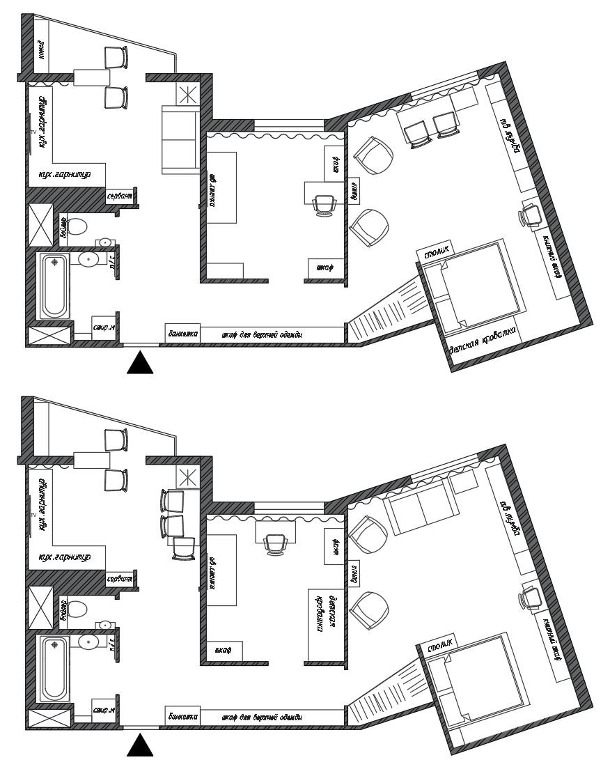 Для Вашего удобства добавили два варианта расстановки мебели, оба из которых отражены на фото. Могу  помочь с разработкой планировочного решением будущим владельцам квартиры, обращайтесь.