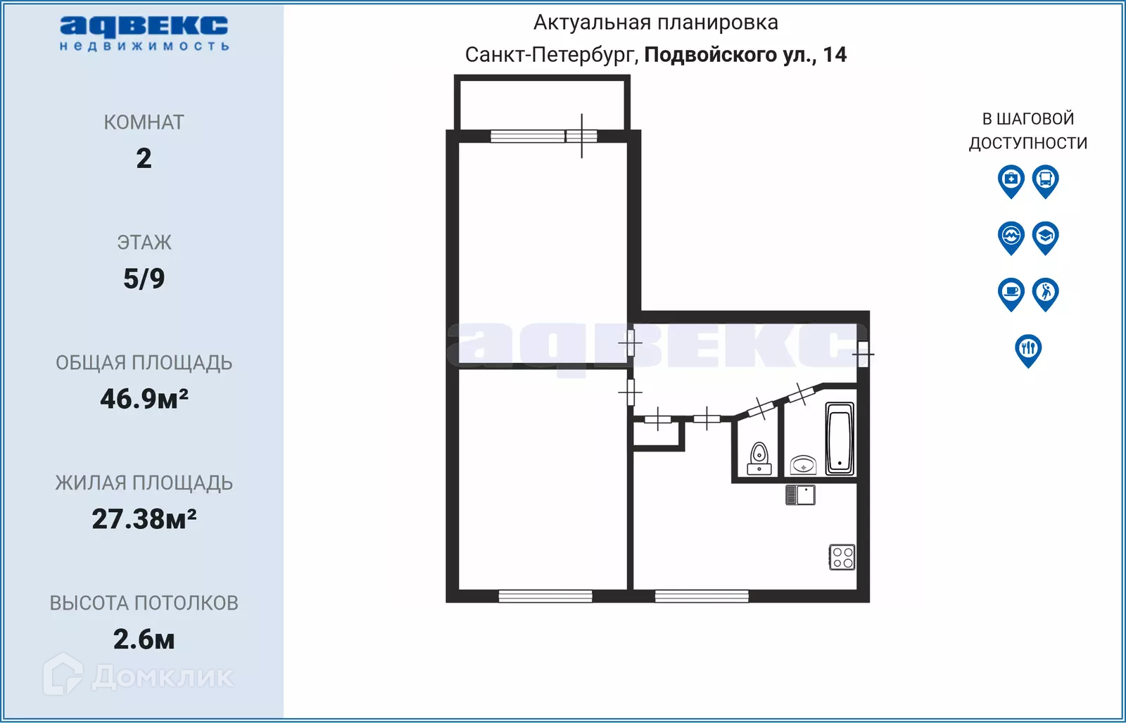2-комнатная квартира, 46.9 м2, этаж 5 / 9, на продажу в Санкт-Петербурге, улица Подвойского, 14к1литЗ