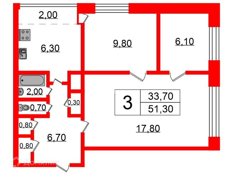 Общая площадь 51.3 м2