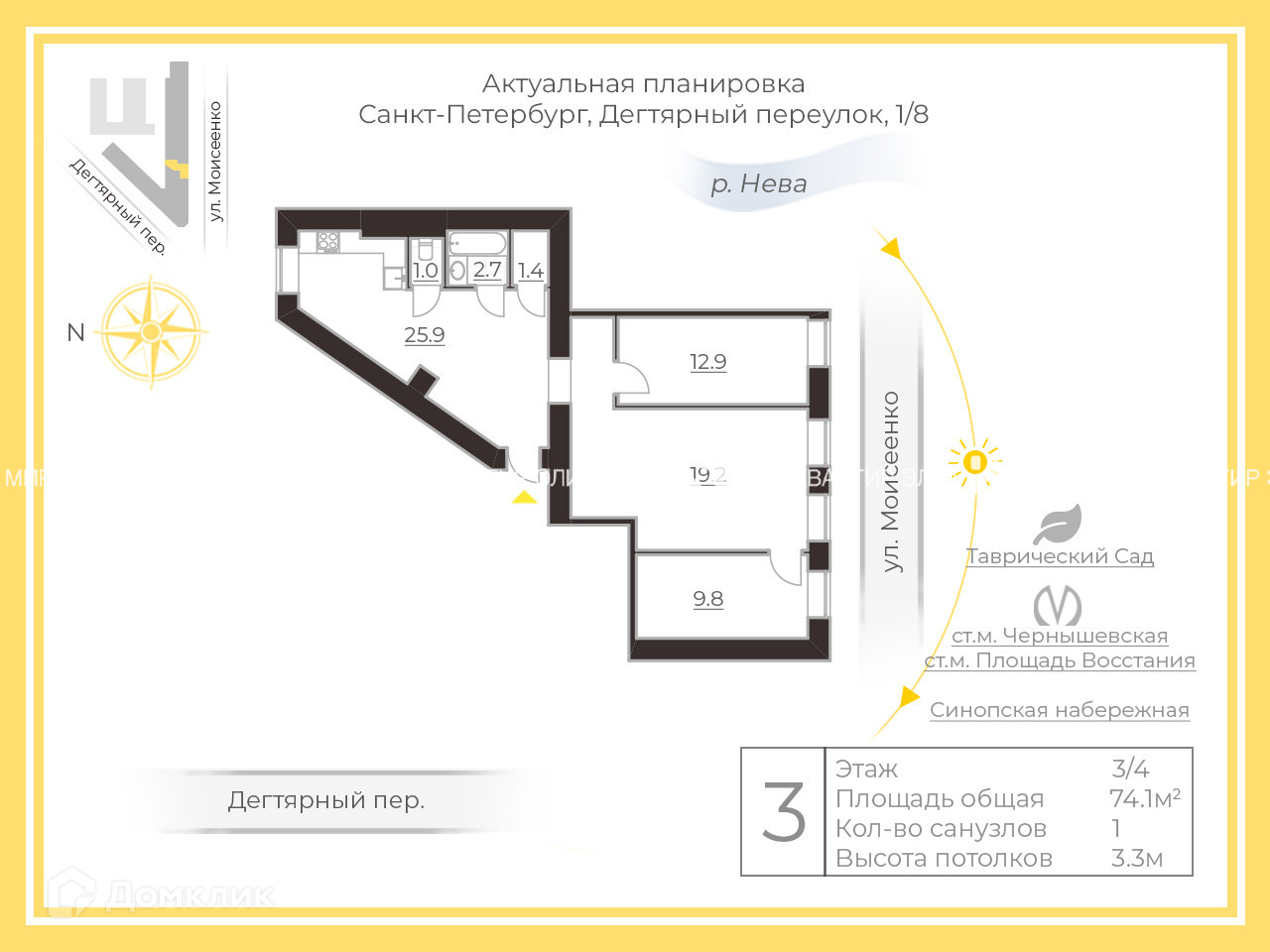 3-комнатная квартира, 74.1 м2, этаж 3 / 4, на продажу в Санкт-Петербурге, Дегтярный переулок, 1/8А