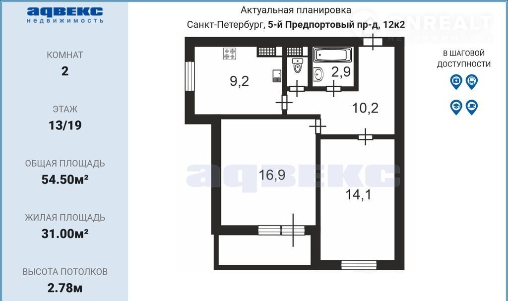 2-комнатная квартира, 54.5 м2, этаж 12 / 19, на продажу в Санкт-Петербурге, 5-й Предпортовый проезд, 12к2