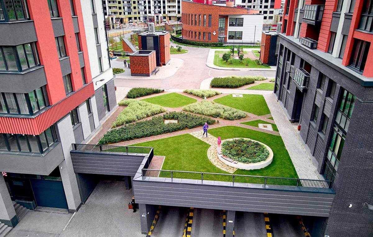 Двор разделен на тематические зоны, вокруг домов расположены прогулочные зоны, посажены фруктовые сады, деревья и кустарники.
