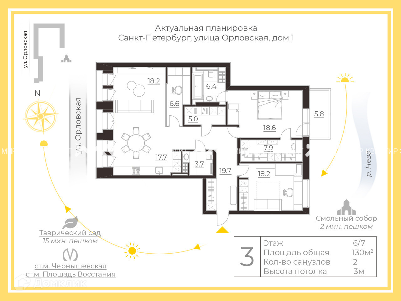 3-комнатная квартира, 130 м2, этаж 6 / 7, на продажу в Санкт-Петербурге, Орловская улица, 1к2