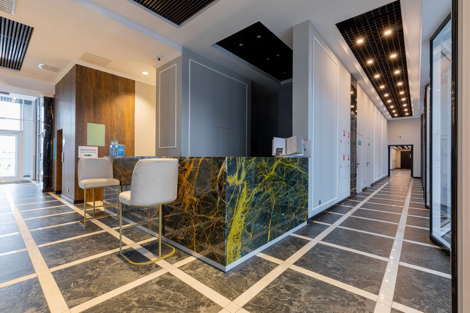 На первых этажах есть вся необходимая инфраструктура, включая кофейни и сферы услуг, а в скором времени будет спортзал и ресторан.