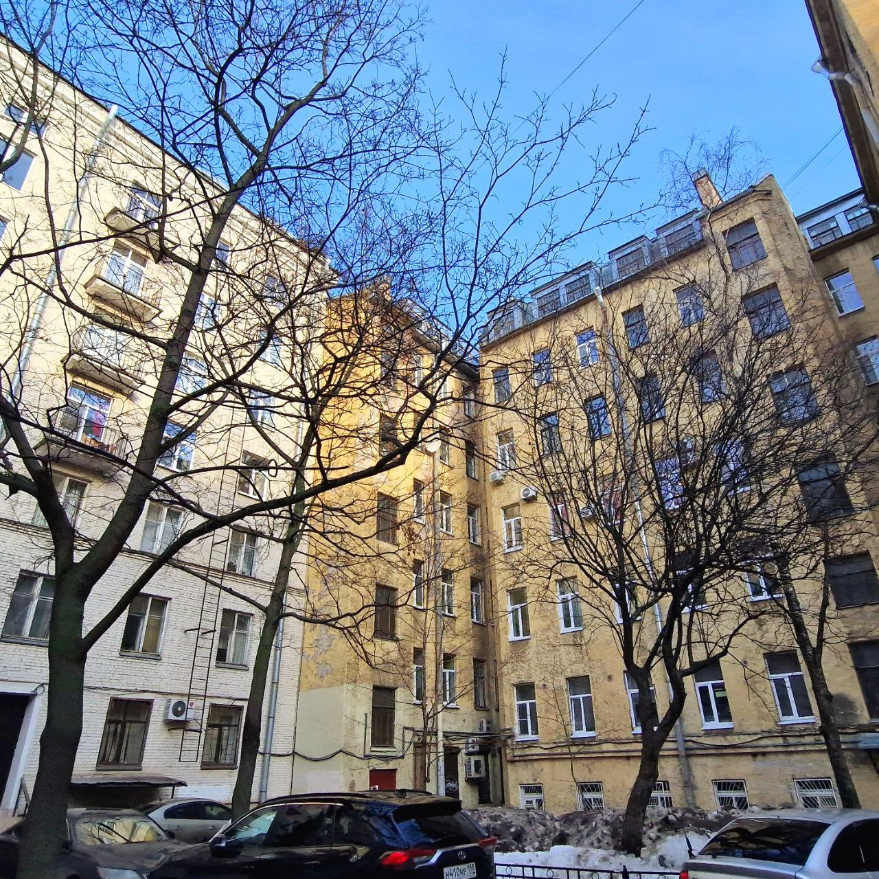 Большой благоустроенный двор, много зелени, достаточно мест для парковки. Из двора