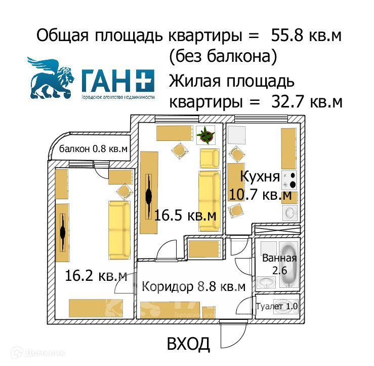 Общая площадь квартиры 55.80 кв.м. (без балкона).