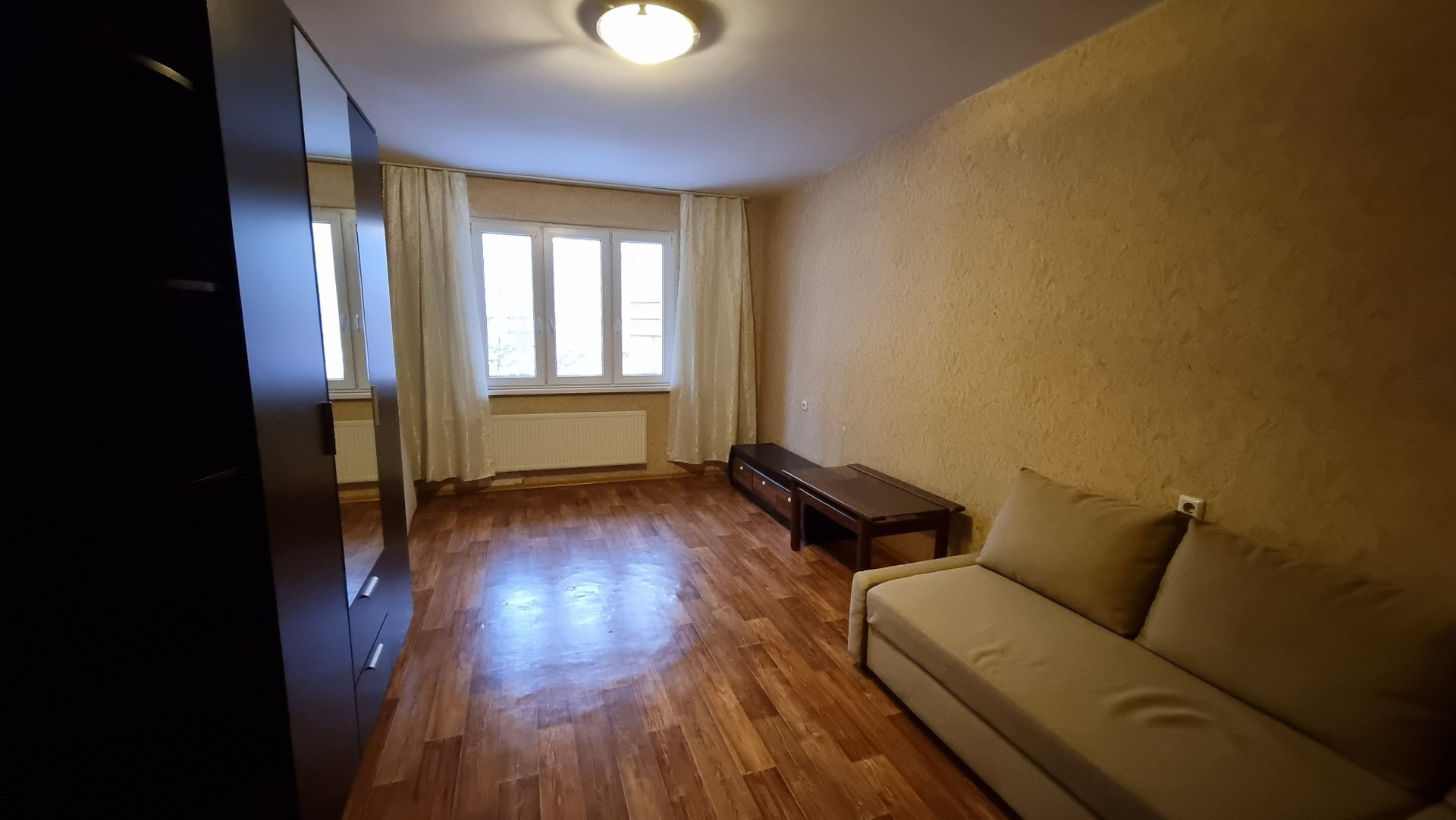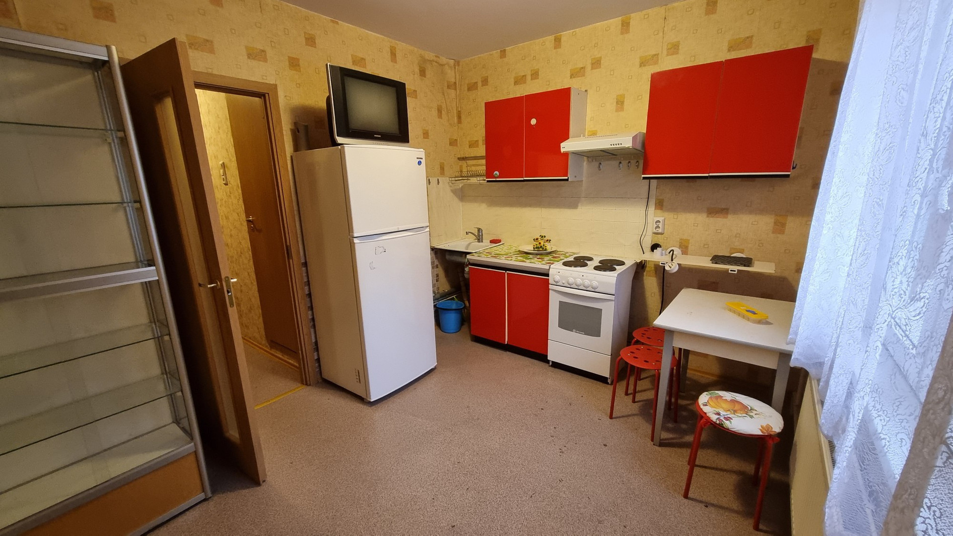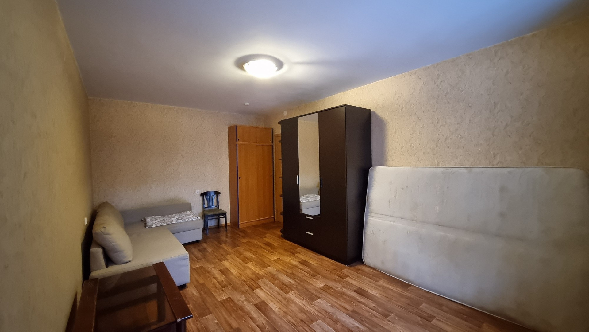 В комнате имеется шкаф, комод, угловой трёхместный диван, в прихожей вместительные полки, на кухне стол, холодильник и четыре шкафа для посуды.