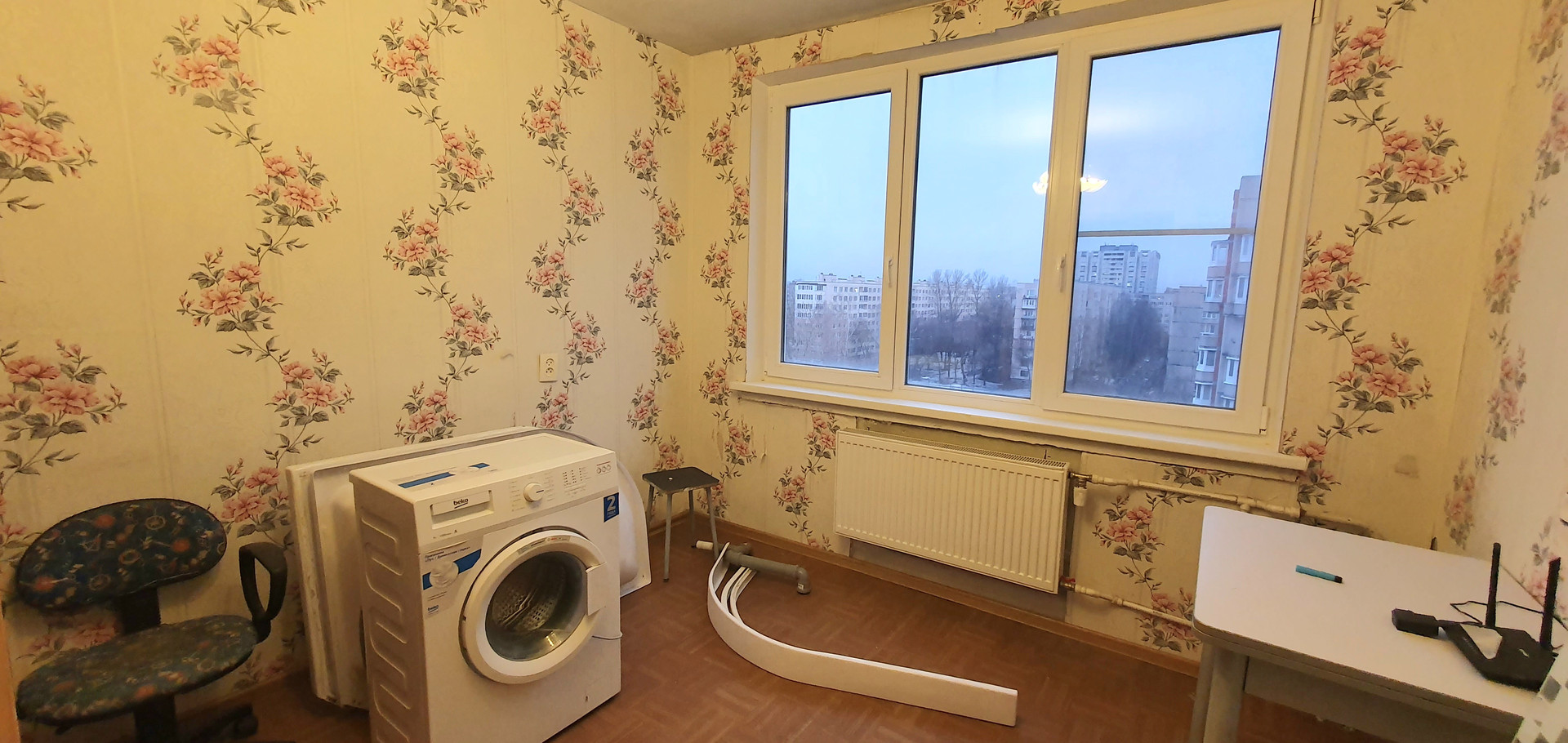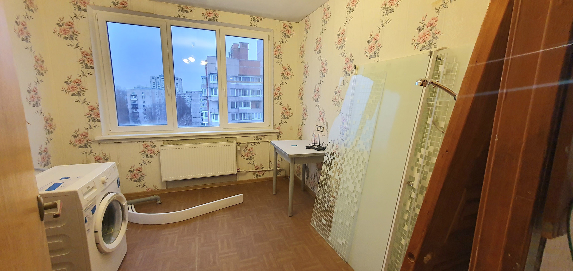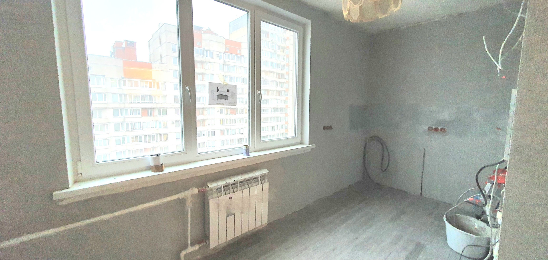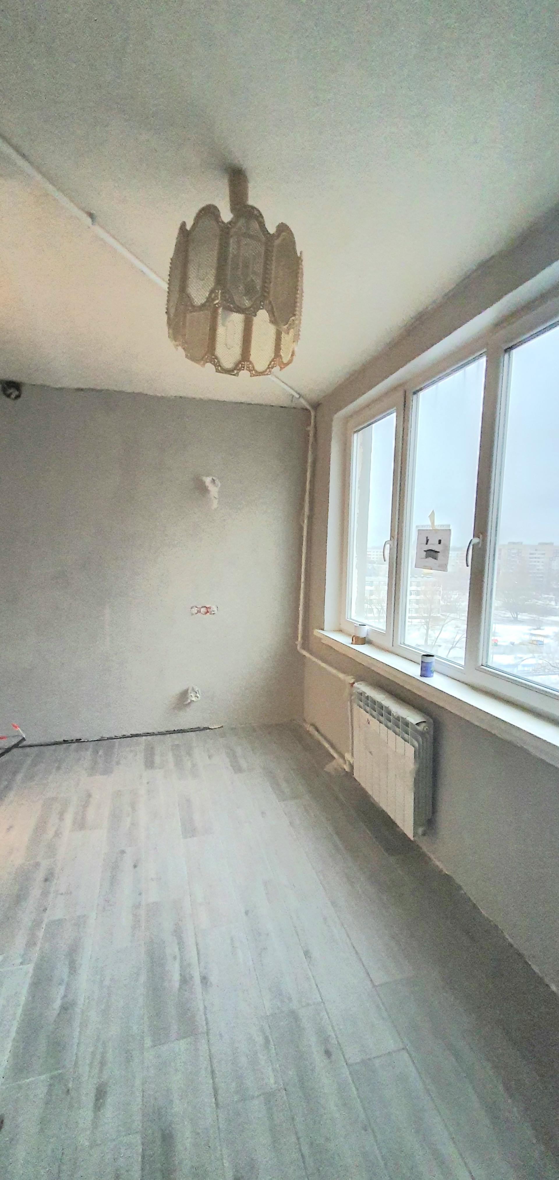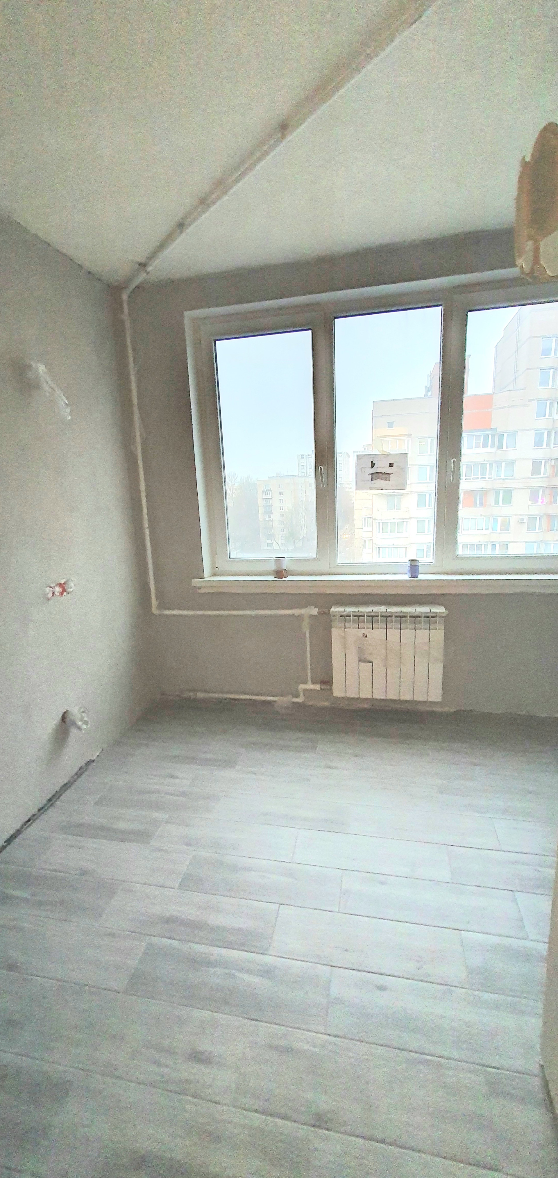 В квартире частично выполнен ремонт: проводка разведена, заменены трубы, установлены счетчики, , заменены батареи. Установлены стеклопакеты, застеклена лоджия площадью 3,9м. На полу в коридоре, санузле и кухне плитка, на кухне выровнены стены и покрыты декоративной штукатуркой. Санузел в кафеле, сантехника не установлена.