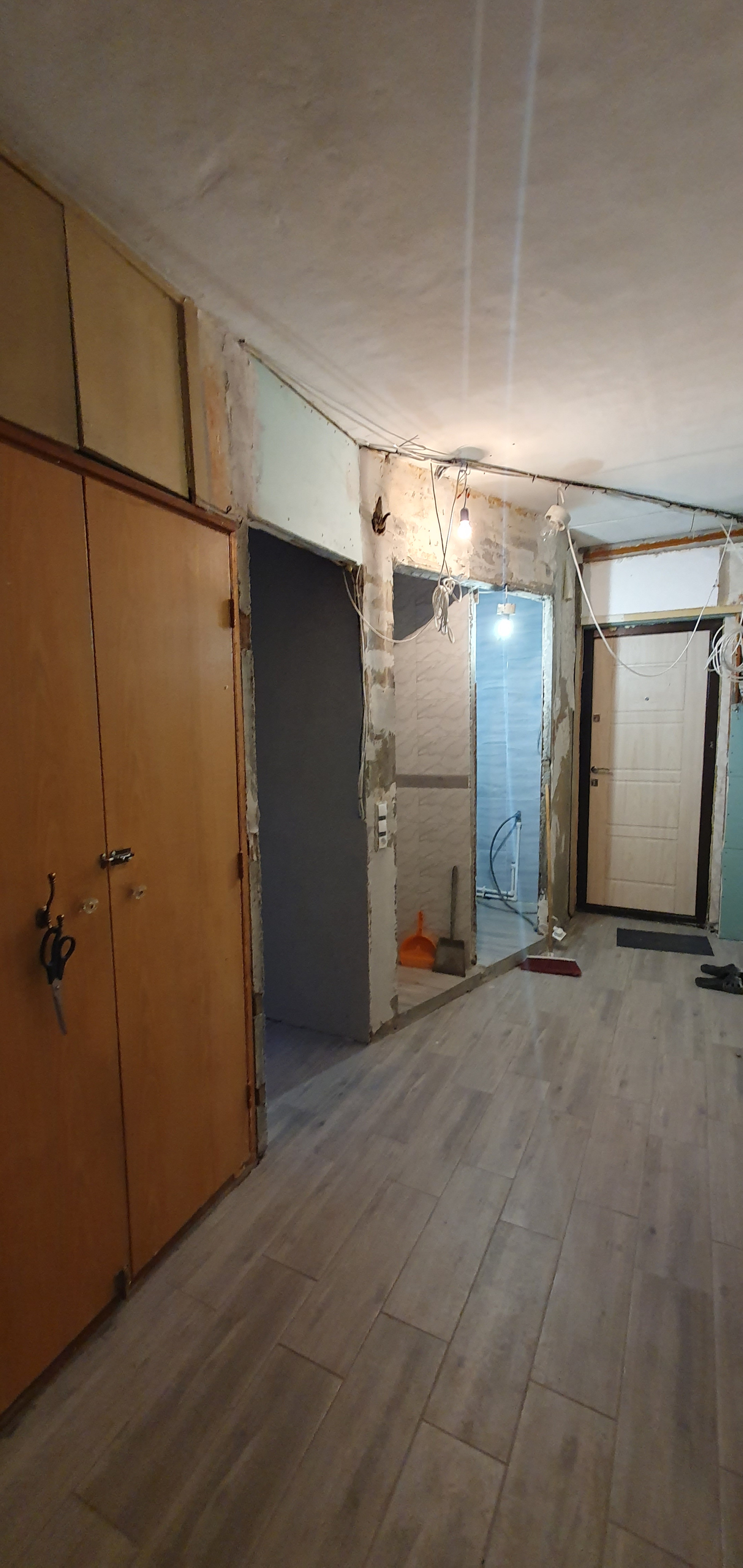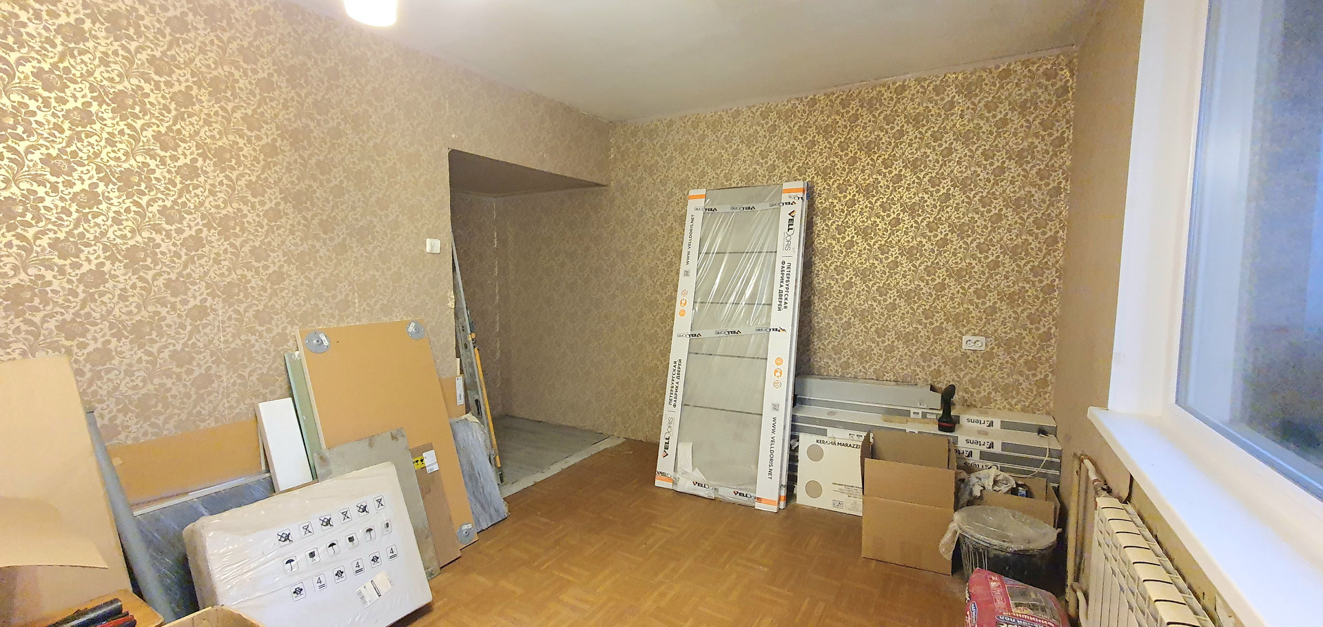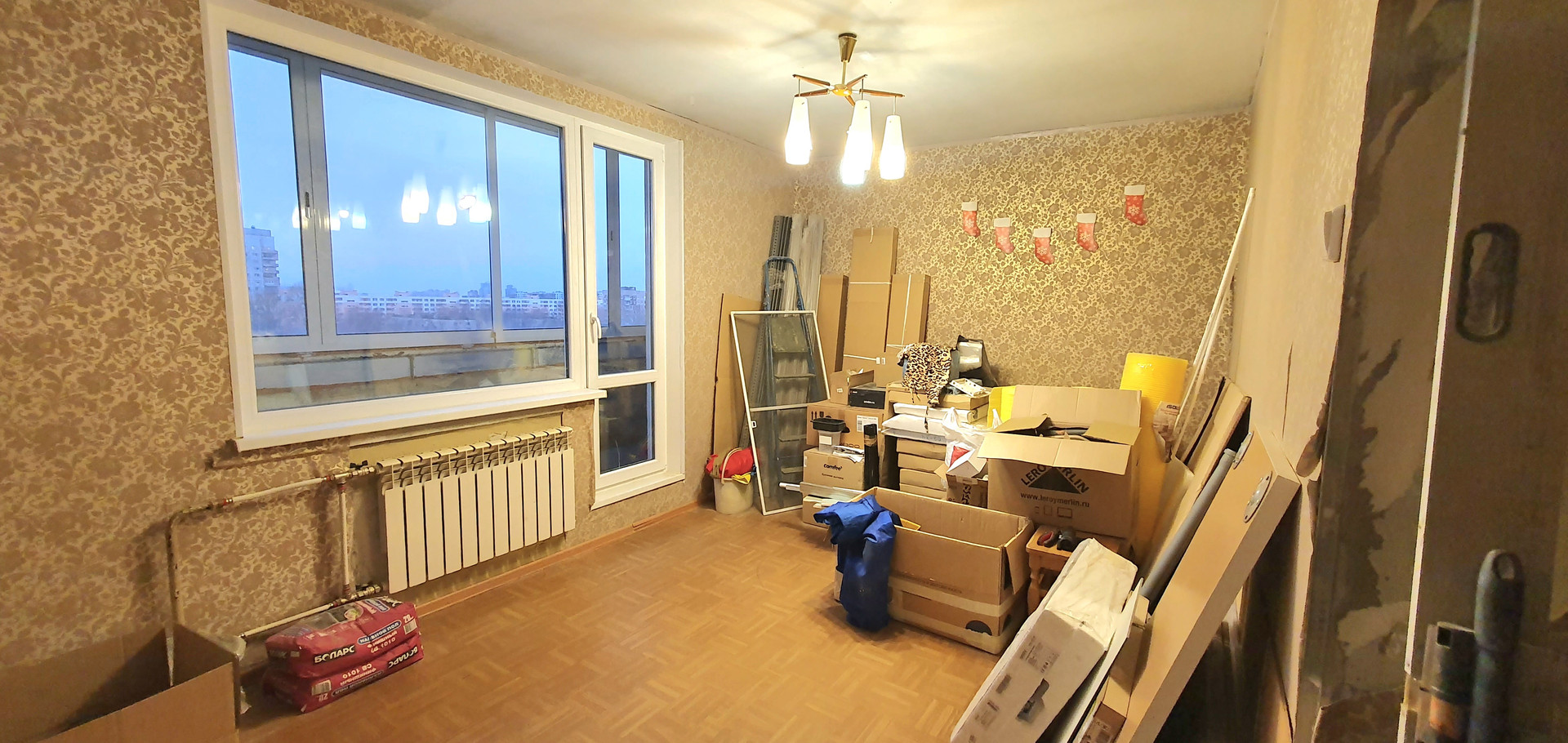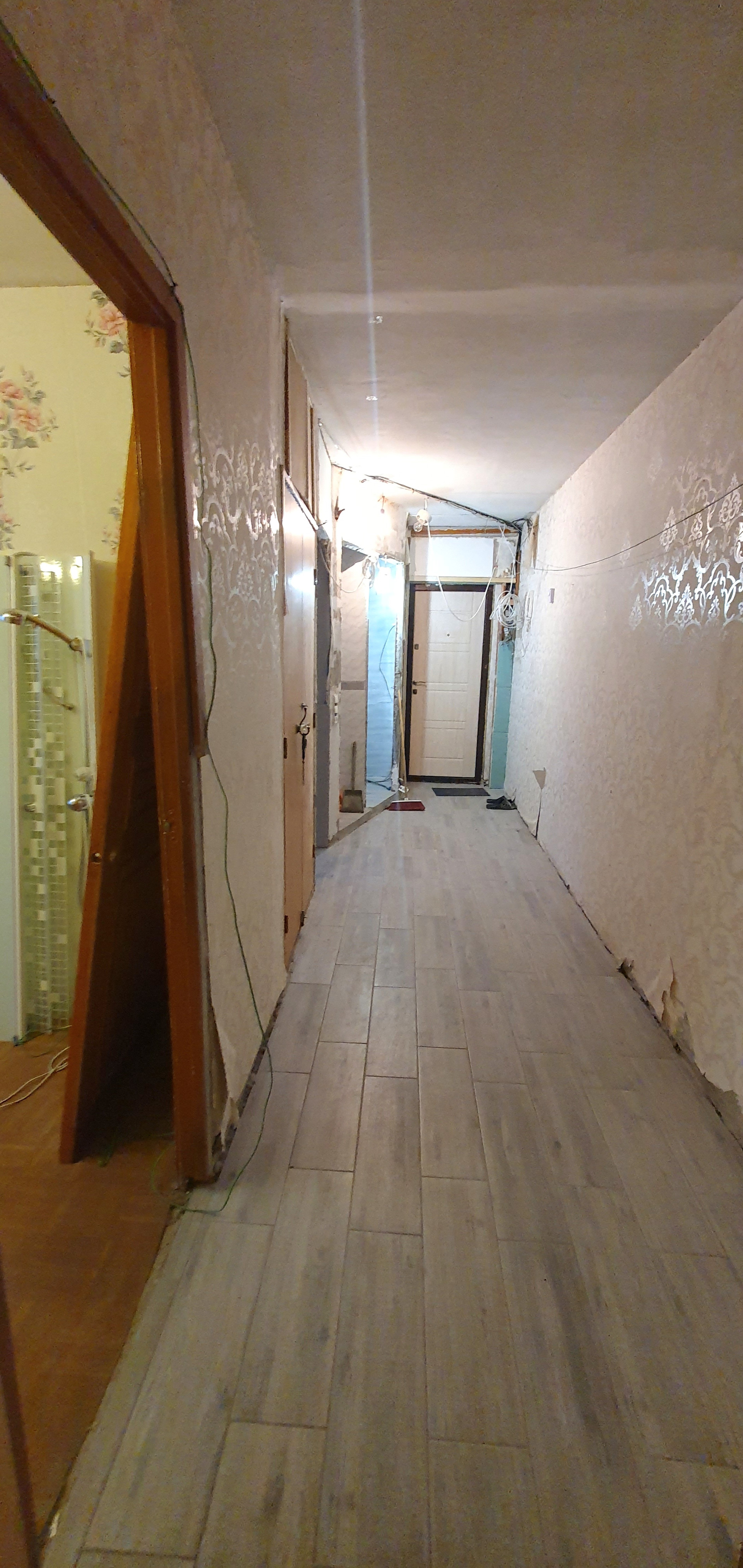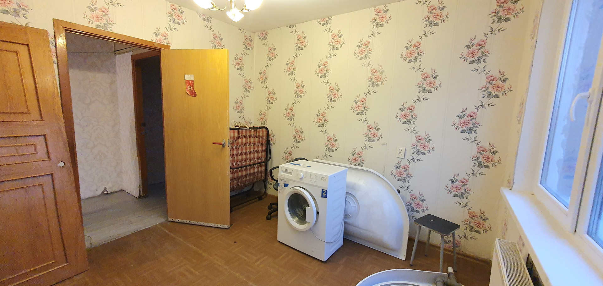 В квартире частично выполнен ремонт: проводка разведена, заменены трубы, установлены счетчики, , заменены батареи. Установлены стеклопакеты, застеклена лоджия площадью 3,9м. На полу в коридоре, санузле и кухне плитка, на кухне выровнены стены и покрыты декоративной штукатуркой. Санузел в кафеле, сантехника не установлена.