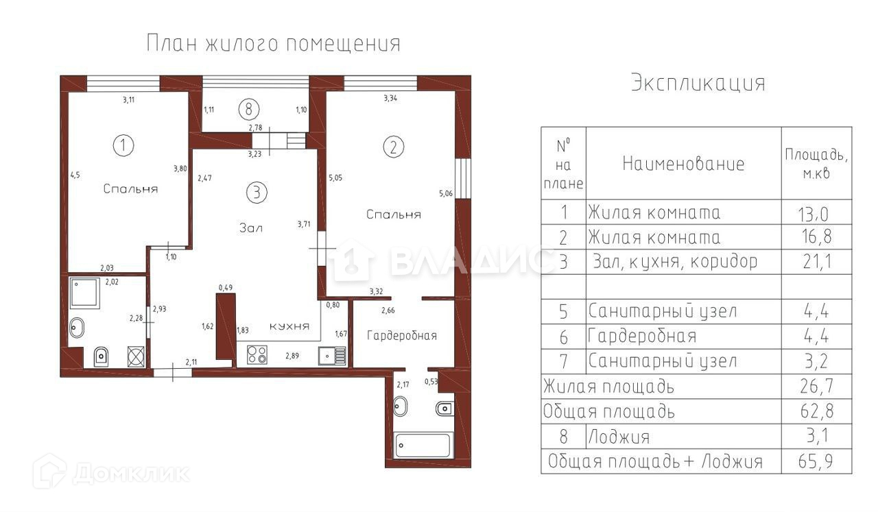 Общая площадь 65.9 м2