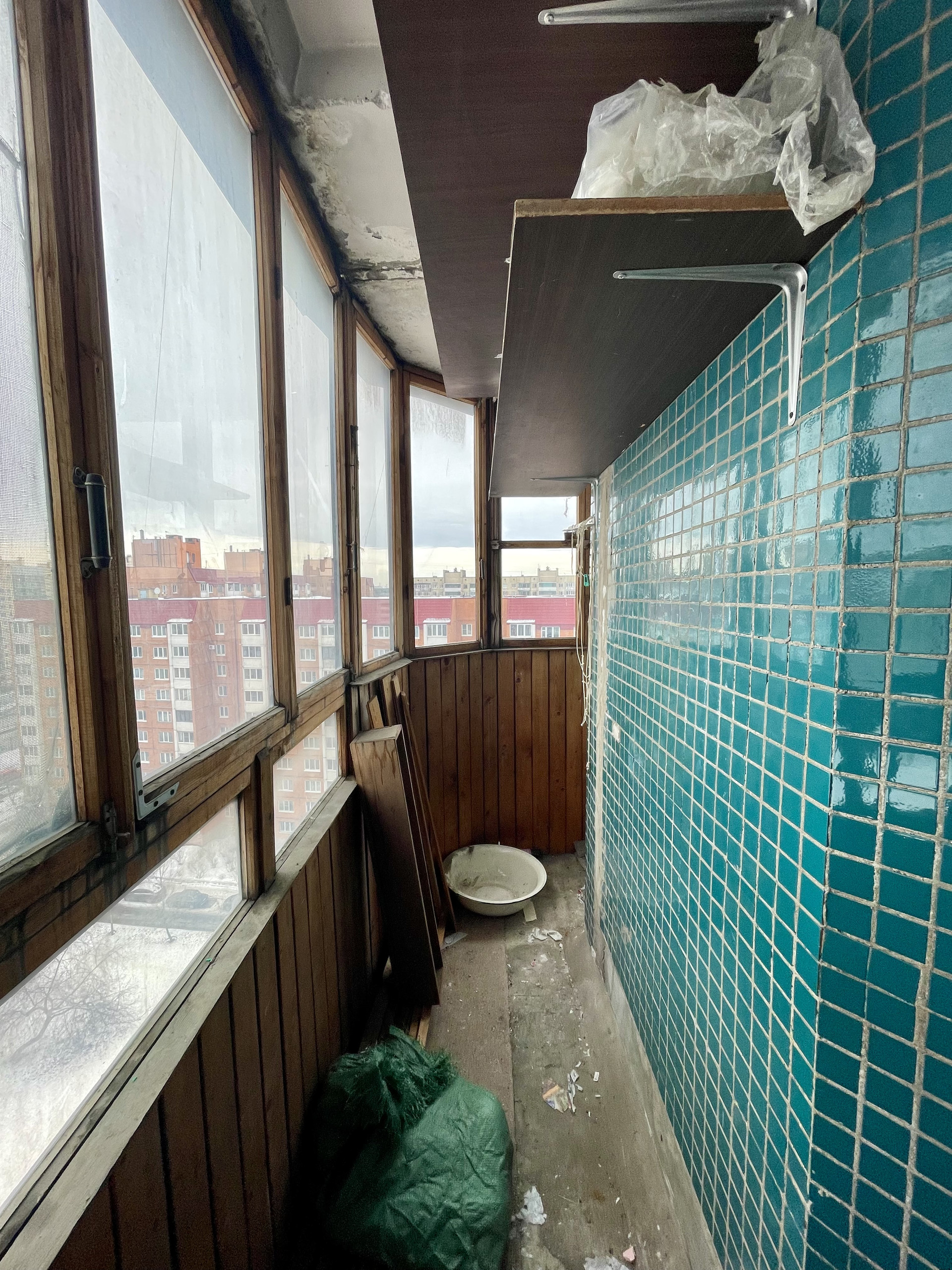 Огромный балкон; огибая угол квартиры, практически покрывает её полупериметр - перспективная зона с точки зрения организации пространства: рекреационная зона, зона для хранения, зимний сад.