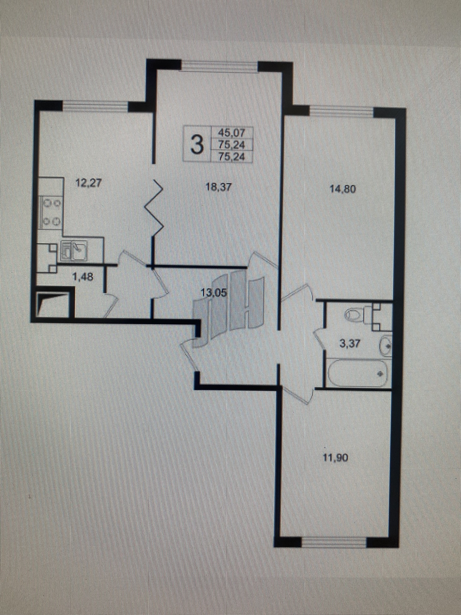 3-комнатная квартира, 75.6 м2, этаж 12 / 12, на продажу в Санкт-Петербурге, Кушелевская дорога, 3к4