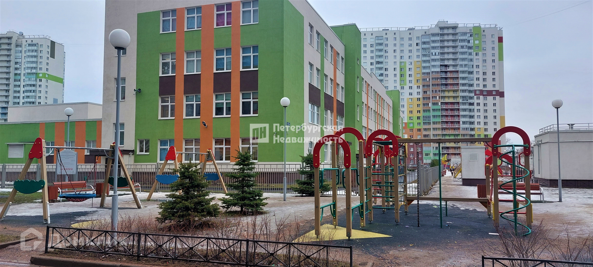 Во дворе много детских и спортивных площадок, школа и детский сад. Имеется подземный паркинг и открытая парковка рядом с домом. Метро в 7-ми минутах ходьбы, до центра города 10 минут транспортом.