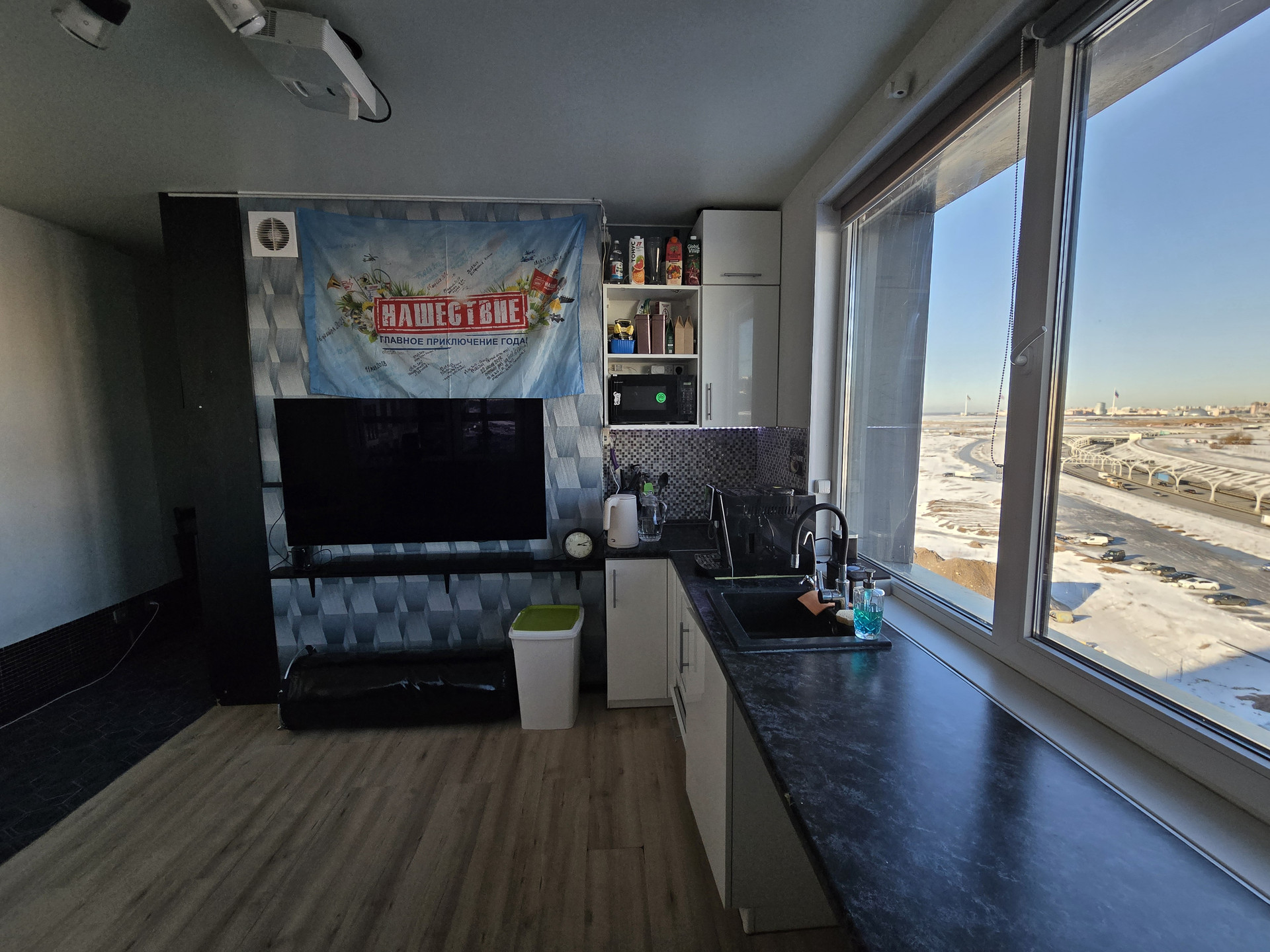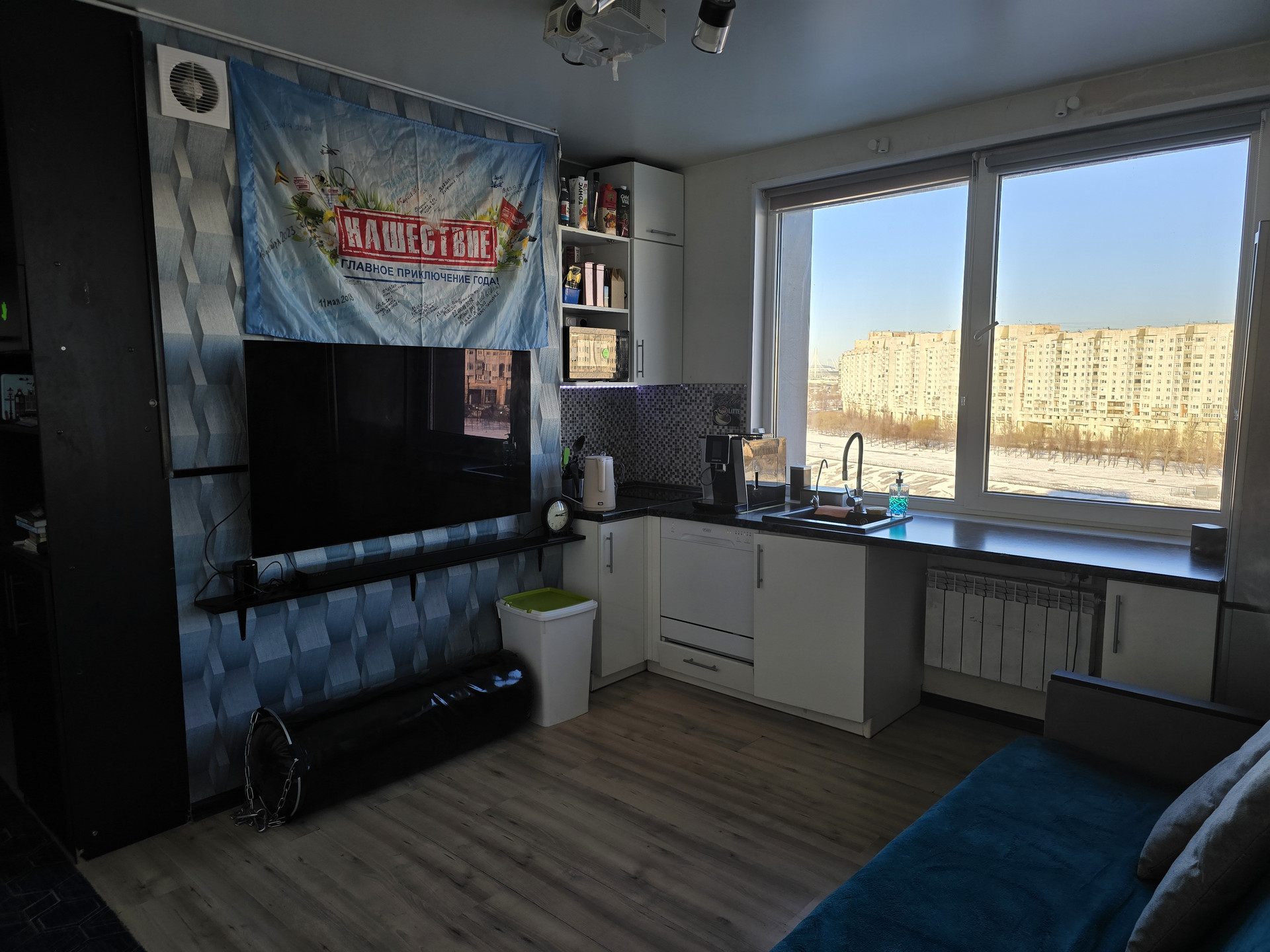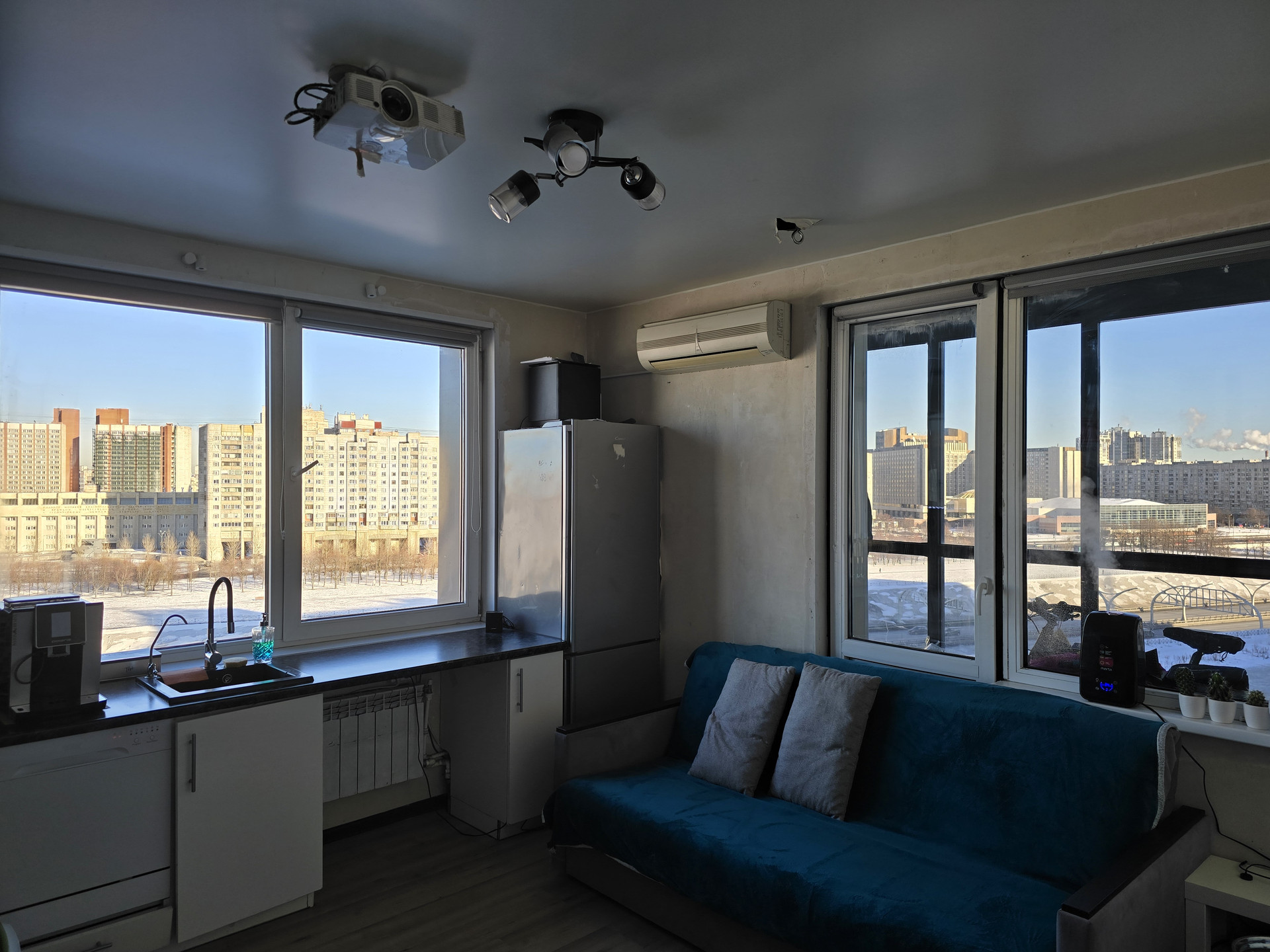 Уютная видовая студия с угловым расположением. Большие окна. Вид на Морскую Набережную, Газпром Арену. Окна выходят на южную и западную стороны.  Застеклённая в пол лоджия. Сделана премиальная шумоизоляция на одну главную стену граничащую с соседями, поэтому в квартире тихо и вечерами можно спокойно слушать музыку, общаться с гостями, смотреть фильмы.  Большая ванная.  Установлен кондиционер.