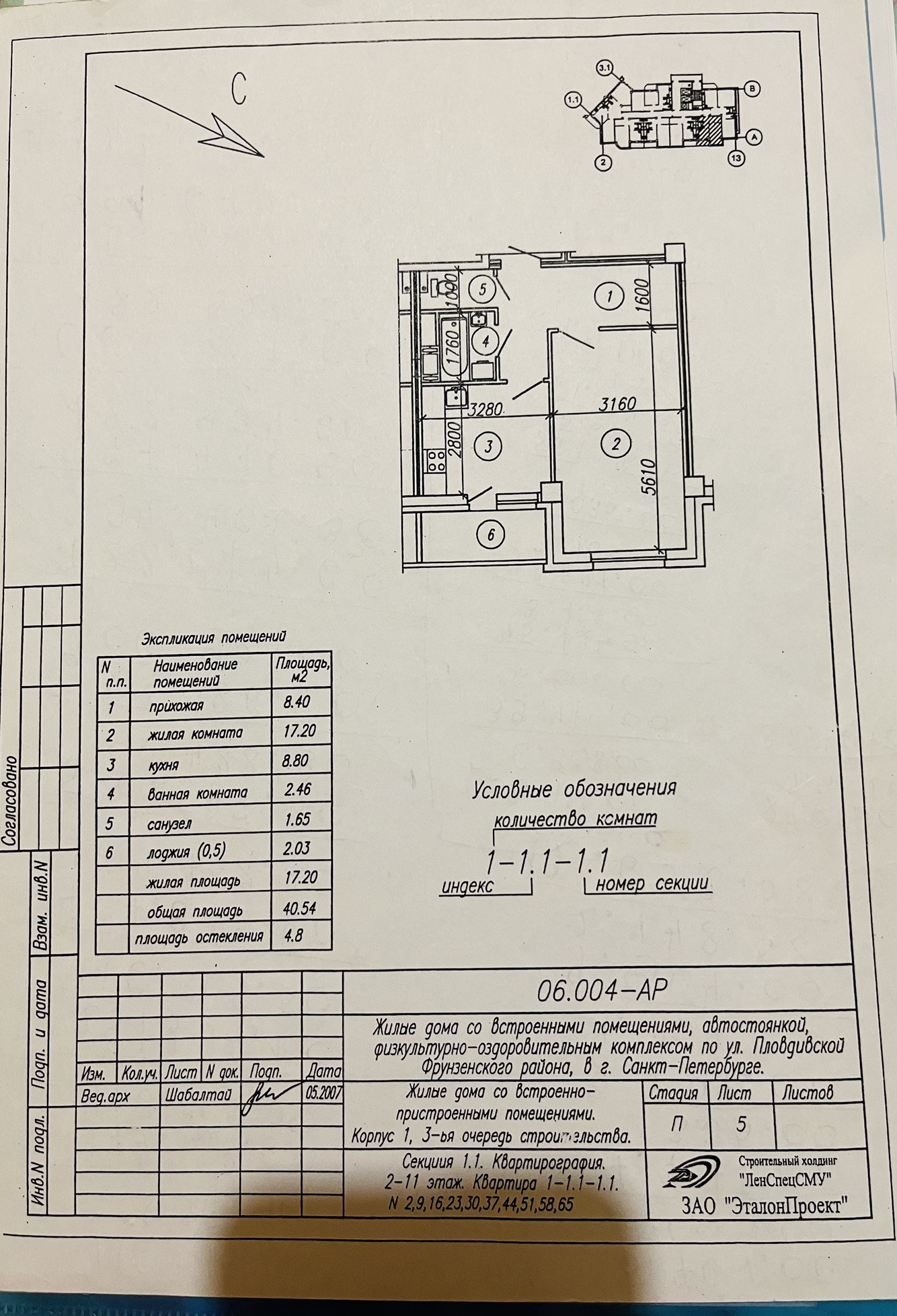Общая площадь 40.54 м2