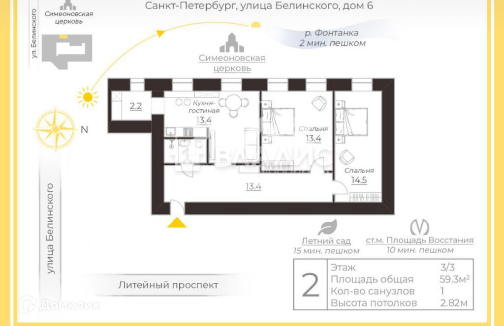 2-комнатная квартира, 60 м2, этаж 3 / 3, на продажу в Санкт-Петербурге, улица Белинского, 6